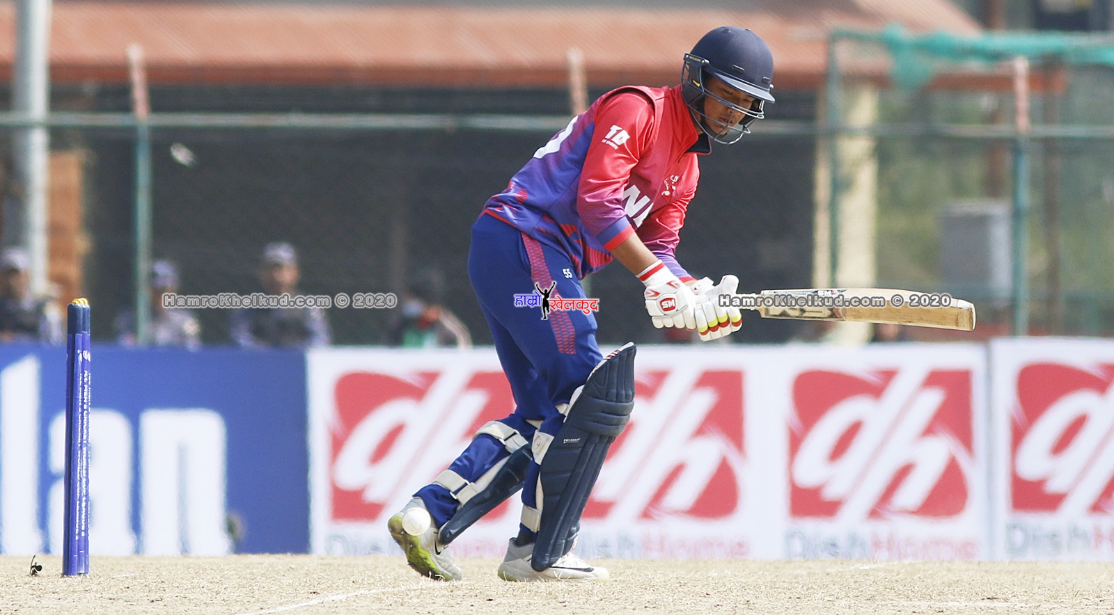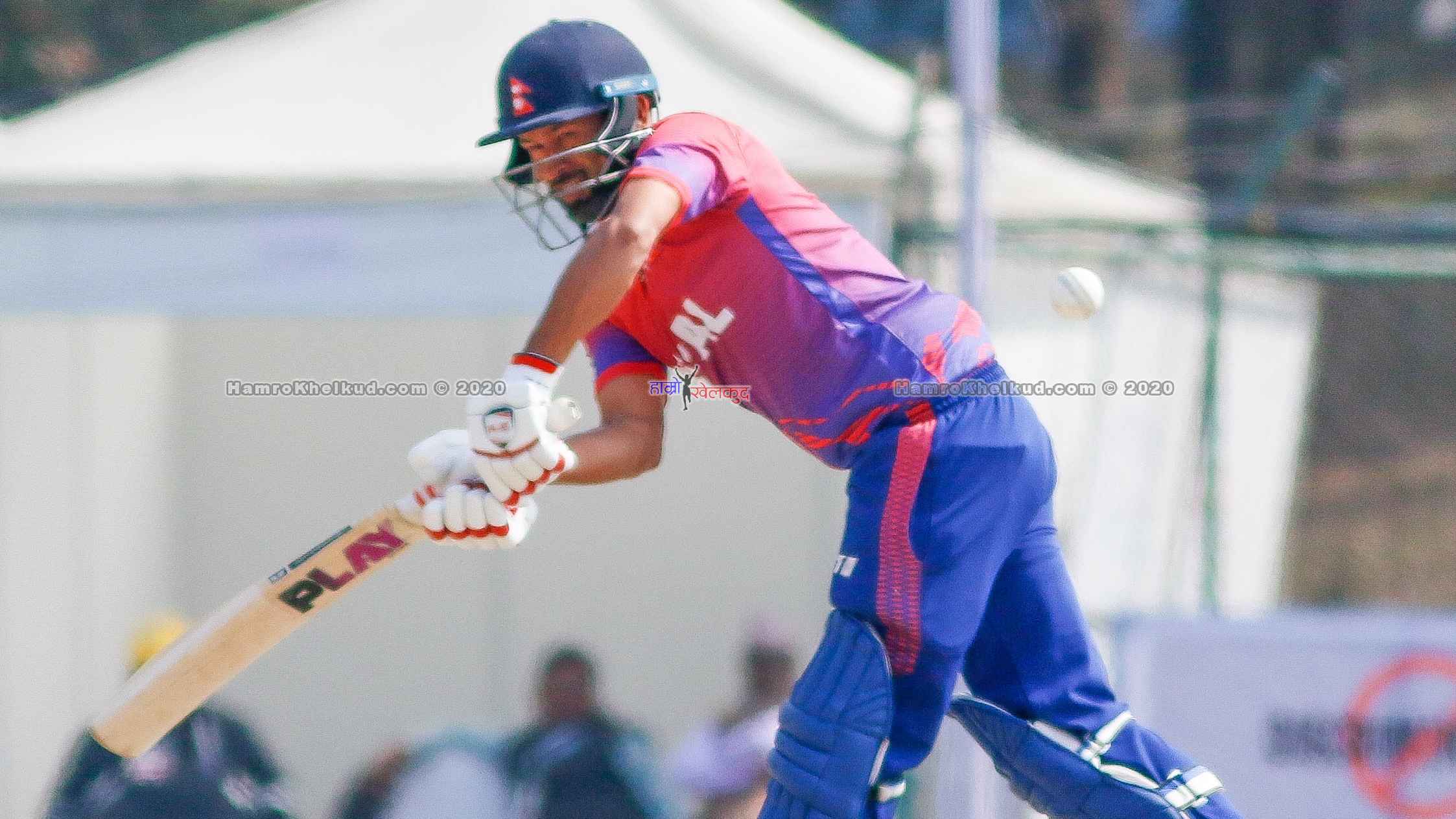 पारसले ५२ बलमा २ चौका प्रहार गरे । सौरभको २१ औं ओभरको पाँचौ बलमा आरिफ शेख ठूलो सट खेल्नेक्रममा वैकल्पिक फिल्डर नास्तुष केन्ज़ीगेले उत्कृष्ट एक हातले क्याच लिदै २ रनमा पेभिलिएन फर्किदा नेपाल ४९-५ को कमजोर अवस्थामा पुगेको थियो । करण केसी तल्लोक्रममा २१ बलमा २ चौका प्रहार गर्दै १२ रनमा क्याच आउट भए ।