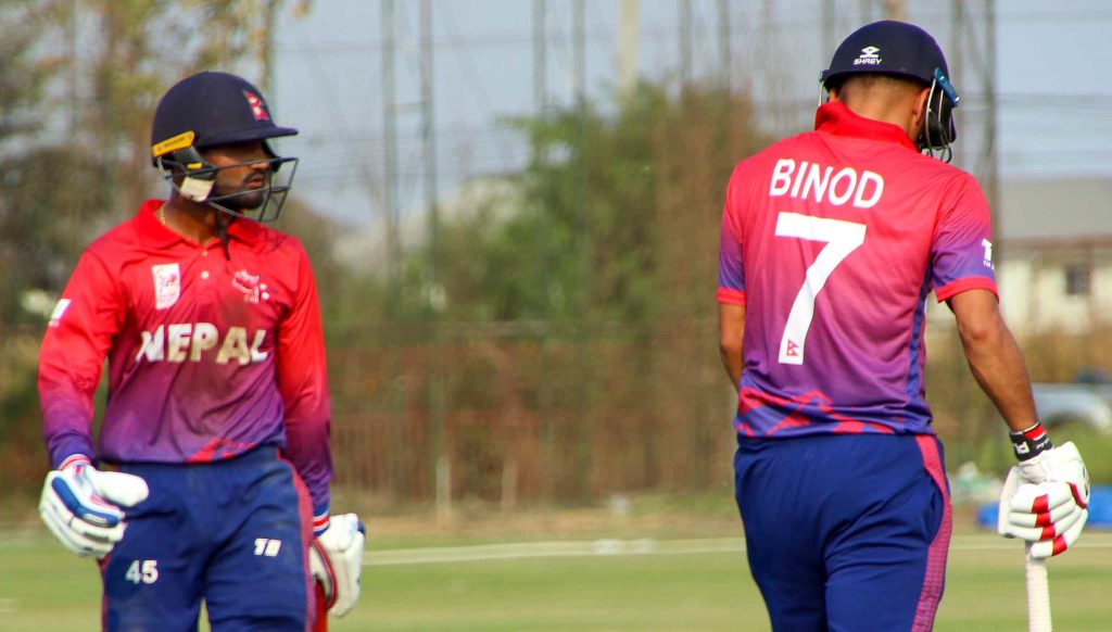 त्यसपछिका ब्याट्सम्यानले स्कोर बोर्डमा रनलाई ख्याल नगरि आफ्नो विकेट जोगाउनतर्फ लाग्दा अन्त्यतिर आक्रामक ब्याटिङको आवश्यकता परेको थियो । तर तल्लोक्रममा विनोद भण्डारी ११ बलमा ७, आरिफ शेख ५ रनमा आउट भए । कुनैपनि ब्याट्सम्यानले राम्रो प्रर्दशन गर्न सकेनन् । मध्यम लक्ष्य पाएपनि खराब ब्याटिङको कारण पराजित हुन पर्यो ।