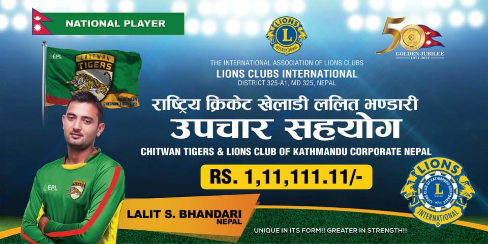 चितवन टाइगर्सले लायन्स क्लब अफ काठमाडौं कर्पोरेट नेपालसँग मिलेर १ लाख ११ हजार १ सय ११ रुपैंया ११ पैसा उपचारका लागि प्रदान गरेको हो । चितवन टाइगर्सका मालिक एवंम लायन्स कर्पोरेट नेपालका संस्थापक अध्यक्ष किशोर भट्टराई, अध्यक्ष शुशील विष्टले बुधबार ग्रान्डी अस्पतालमा पुगेर ललितकी श्रीमति ममतालाई चेक प्रदान गरेका थिए । सो अवसरमा चितवन टाइगर्सका मार्की एवंम राष्ट्रिय खेलाडी सोमपाल कामी र राष्ट्रिय टोलीका पूर्व कप्तान विनोद दास, लायन्स क्लबका कोषाध्यक्ष रमेश रुपाखेती उपस्थित रहेका थिए ।