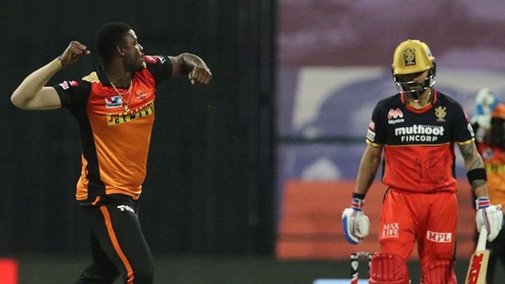 होल्डरले १६ औं ओभरको चौथो बलमा शिवम् दुबेलाई कप्तान डेभिड वार्नरबाट ८ रनमा क्याच आउट गराए । वासिन्टन सुन्दर ५ रनमा क्याच आउट भए । तीव्र गतिका बलर टि नटराजनले १८ औं ओभरको पाँचौ बलमा योर्करमा बोल्ड आउट गरेपछि बेंगलोर बलियो योगफलको सम्भावना टाढिएको थियो । नवदीप सैनी ९ र मोहम्मद शिराज १० रनमा अविजित रहे ।