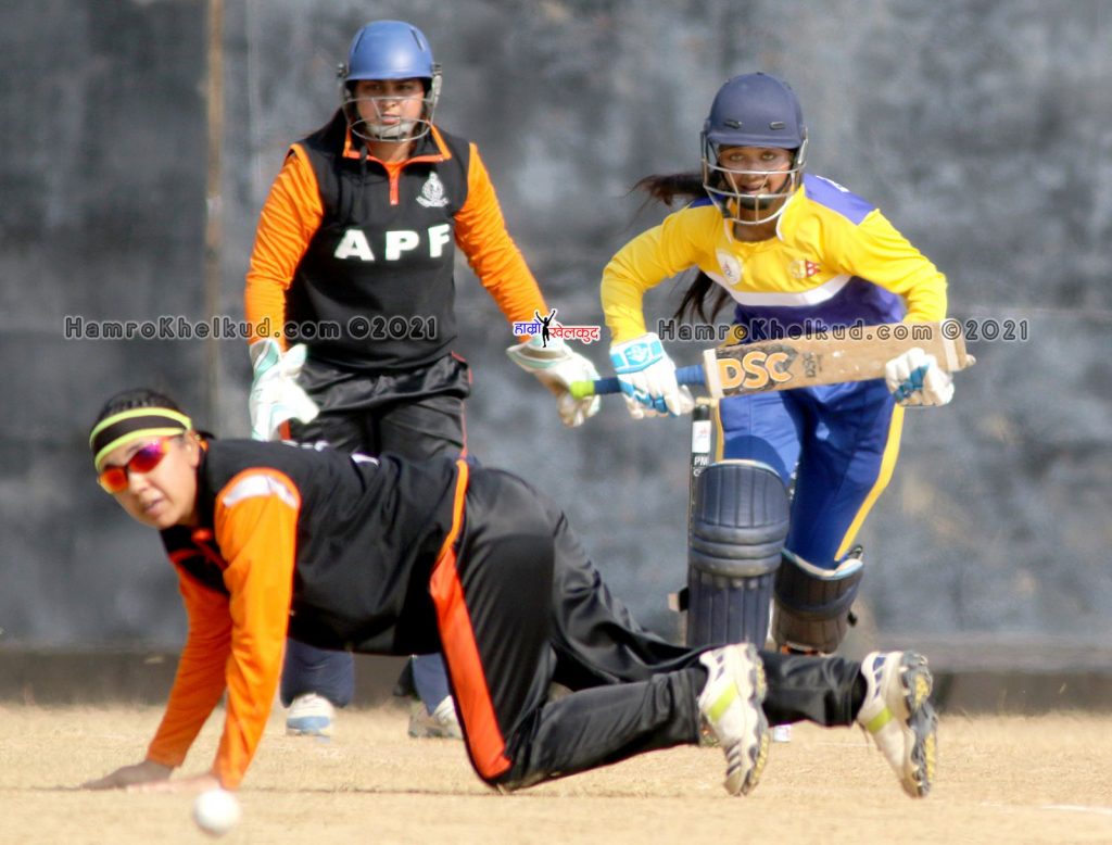 सातौं ओभरको पाँचौं बलमा सोनु खड्कालाई रोमा थापाले १ रनमा रन आउट गराएपछि एपिएफ संकटमा परेको थियो । एलिसा खदियाले ४ ओभरमा १३ रन खर्चेर २ विकेट लिइन् । कप्तान रुविनाले ४ ओभरमा १४ रन खर्चेर २ विकेट लिइन् । संगिता राईको नाममा एक विकेट रह्यो ।