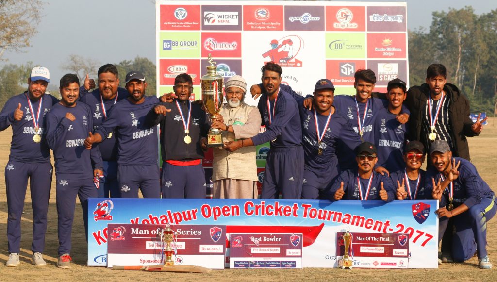 काठमाडौं (हाम्रो खेलकुद) – कोहलपुर ओपन क्रिकेट प्रतियोगिताको उपाधि बिबी वारियर्स नेपालगन्जले जितेको छ । शनिवार कोहलपुर प्रस्तावित अन्तर्राष्ट्रिय क्रिकेट मैदानमा भएको फाइनलमा बिबी वारियर्सले आयोजक टिम कोहलपुर क्रिकेट एकेडेमीलाई ४ विकेटले पराजित गर्दै उपाधि जितेको हो ।