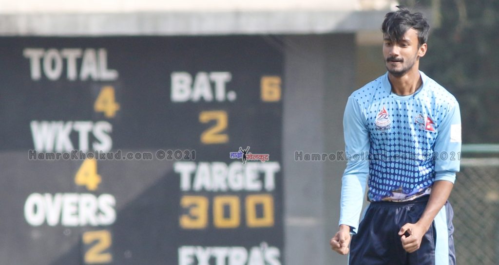 तीव्र गतिका बलर रामनरेश गिरीले ५ ओभरमा ३२ रन खर्चेर ४ विकेट लिए । नन्दन यादवले २ विकेट लिए । बिविन आचार्य, तिलकराज भण्डारी र दीपेश श्रेष्ठले १–१ विकेट लिए ।