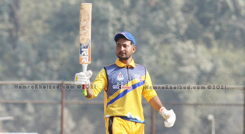 अर्जुन कर्णालीका कप्तान रविन्द्रजंग शाहीको बलमा कटविहाइन्ड हुँदै विकेटकिपर विपिन रावलबाट समातिन पुगेपछि राष्ट्रिय प्रतियोगितामा आफ्नो पहिलो अर्धशतक पूरा गर्न चुकेका थिए । दीनेश बुढामगर १०, सुवास भण्डारी र बिशाल पौडेल १५ रनमा आउट भए । कप्तान विपिन खत्री ३४ बलमा २ चौका र ३ छक्का सहित ३२ रनमा क्याच आउट भए ।