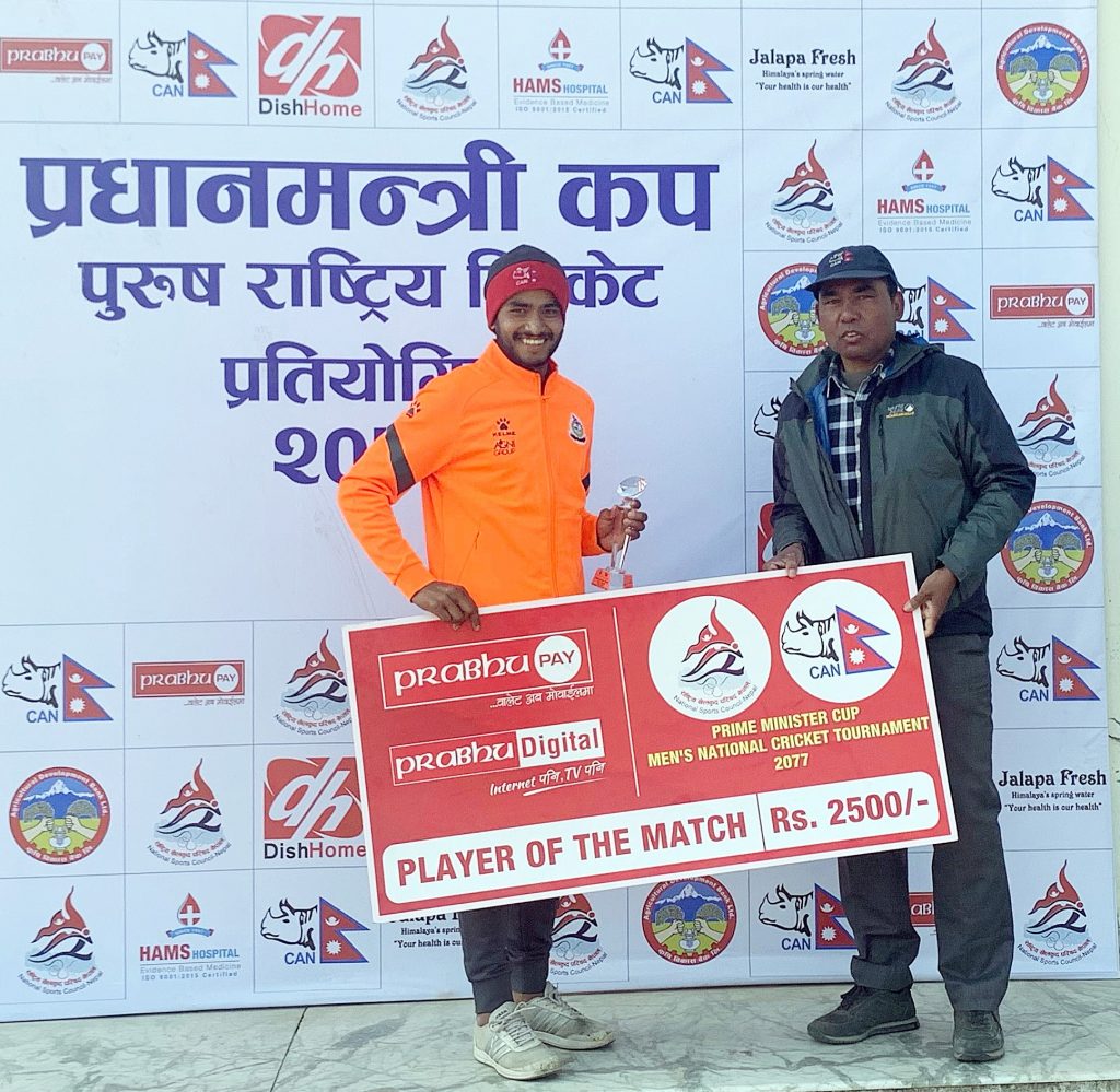त्यसअघि मुलपानी क्रिकेट मैदानमा टस हारेर पहिला ब्याटिङ थालेको गण्डकी ४६ ओभरमा १ सय ६ रनमा अल आउट भएको थियो । गण्डकीका समिर कंडेलले १ सय १४ बलमा २ चौका सहित सर्वाधिक ३६ रनको योगदान दिए । दीनेश बुढामगर १२, दीपेश खत्री र बिष्णु पान्डेले १५–१५ रनको योगदान दिए ।