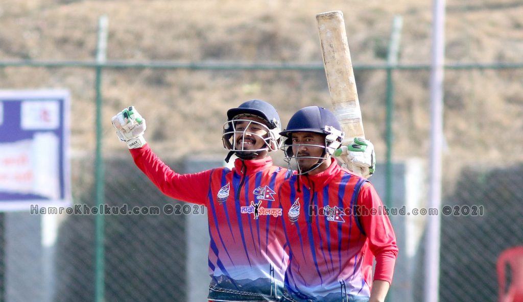 हिमान्शु शाही वसन्त रेग्मीको बलमा ठूलो सट खेल्नेक्रममा २० रनमा कमलसिंह ऐरीबाट क्याच आउट गराए । भुवन कार्कीले राज शाहलाई १२ रनमा बोल्ड आउट गरे । राजले ८ बलमा ३ चौका प्रहार गरे । अभिष्ोक बम ठकुरी ३८ बल खेल्दै १ चौका साथ १२ रनमा स्टम्पिङ आउट भए ।