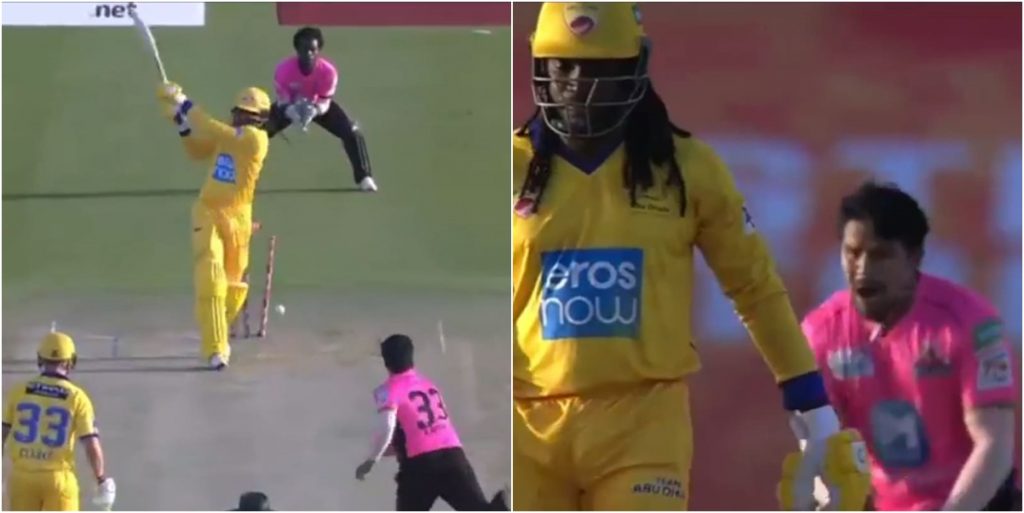 यूएईमा जारी टि १० लिगमा करणले टिम आबूधाबीमा ओपनर समेत रहेका युनिभर्सल बोसका रुपमा चिनिने क्रिस गेललाई चौथो ओभरको पहिलो बलमै ९ रनमा बोल्ड आउट गरेका हुन् ।