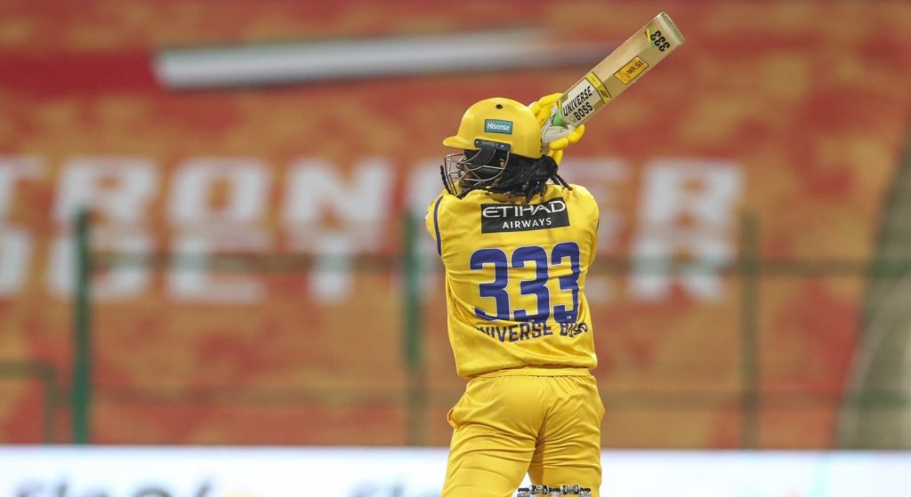 गेलको विष्फोटक इनिङसँगै टिम आबूधाबीले मराठा अरेवियन्सलाई ९ विकेटले हराएको छ । जितको लागि ९८ रनको लक्ष्य पछ्याएको टिम आबूधाबीले ५.३ ओभरमै १ विकेट गुमाउँदै पूरा गर्यो । क्रिस गेल २२ बलमा ६ चौका र ९ छक्का सहित ८४ रनमा अविजित रहे । गेलले १२ बलमा अर्धशतक पूरा गरेका थिए ।