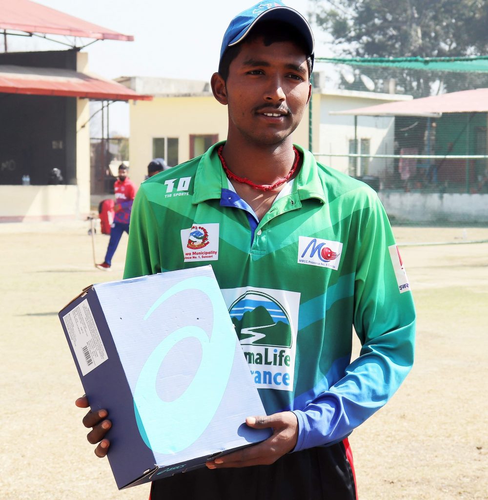 काठमाडौं (हाम्रो खेलकुद) – कर्णाली प्रदेशका तीव्र गतिका बलर अनुज चनाराले नयाँ जुत्ता पाएका छन् । यसै साता नेपाल क्रिकेट संघ (क्यान) ले ओमान भ्रमणको लागि बन्द प्रशिक्षणमा ३२ सदस्य टोलीलाई बोलाएको थियो ।