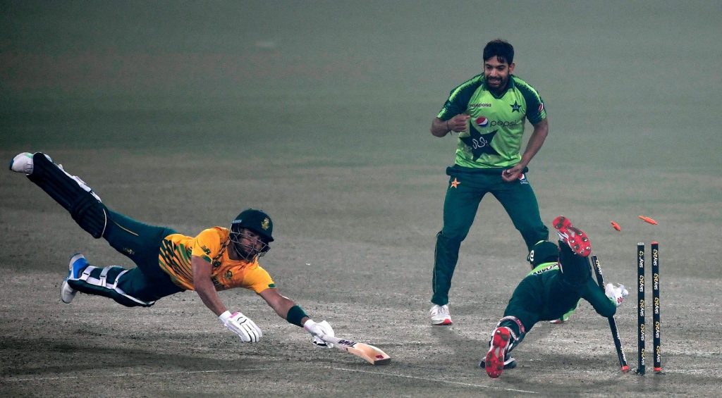 कप्तान हेनरिक क्लासेन १२ र एन्डिले फेहलुकवयो १४ रनमा आउट भए । ड्वाइन प्रिटोरियस १५ र ब्योर्न फोर्टुइन १७ रनमा अविजित रहे । पाकिस्तानका लेग स्पिनर उस्मान कादिरले ४ ओभरमा २१ रन खर्चेर २ विकेट लिए । हरिस रउसले २ र फहिम अशराफले १ विकेट लिए ।