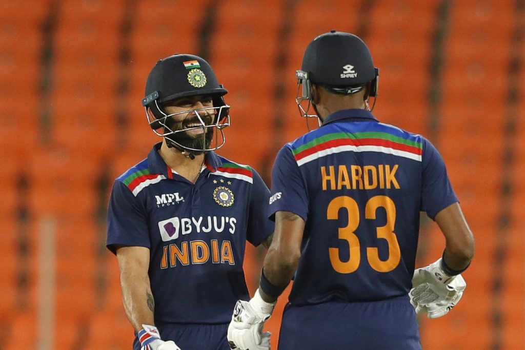 छैटौं ओभरको दोस्रो बलमा युवा ब्याट्सम्यान ईशान किशनलाई क्रिस जोर्डनले विकेटकिपर जस बटलरबाट ४ रनमा क्याच आउट गराए । ऋषभ पन्त १२ औं ओभरको पहिलो बलमा २५ रनमा रन आउट हुन पुगेपछि भारत दबाबमा परेको थियो । पन्तले २० बलमा ३ चौका प्रहार गरे । १५ औं ओभरको तेस्रो बलमा मार्क वुडले श्रेयस ऐरलाई डेविड मलानबाट ९ रनमा क्याच आउट गराएपछि भारत ८६–५ को कमजोर अवस्थामा पुगेको थियो । तर कोहली र हार्दिकले उत्कृष्ट साझेदारी गर्दै इनिङ उकासे ।