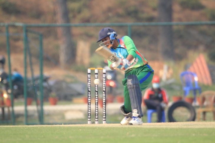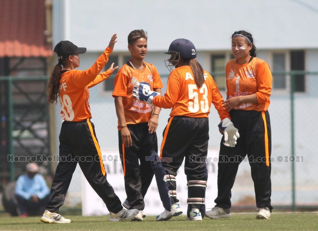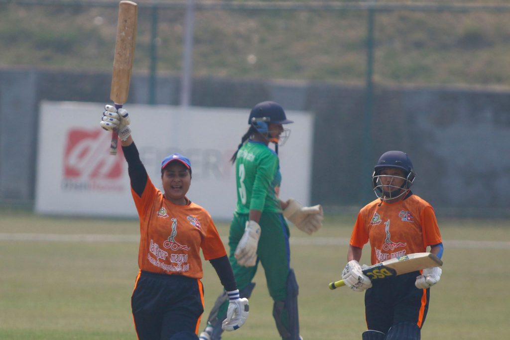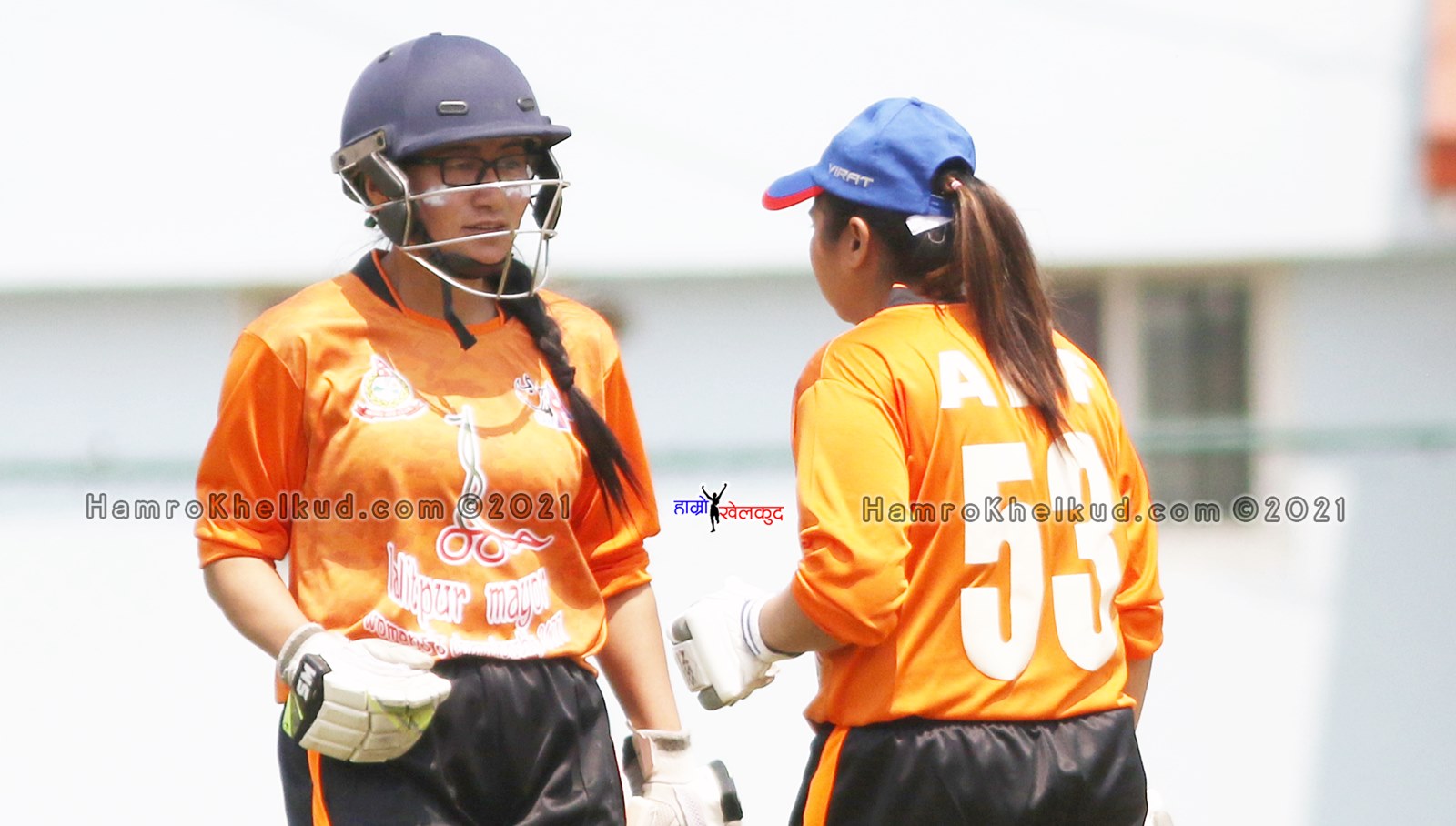 ओपनर ज्योती र कप्तान सीता रानामगरले पहिलो विकेटका लागि ८.४ ओभरमा ५६ रनको साझेदारी गर्दै राम्रो सुरुवात दिलाएका थिए । सीतालाई मध्यगतिकी बलर सुनिता लोहारले १६ रनमा बोल्ड आउट गर्दै साझेदारी तोडेकी थिइन् । त्यसअघि सुनिता लोहारको सातौं ओभरको पाँचौं बलमा विन्दु रावलले मिडअनमा सीताको ब्यक्तिगत १० रनमा क्याच ड्रप गरेकी थिइन् ।