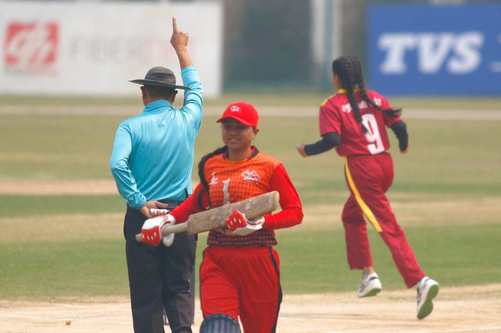 तेस्रो ओभरको पाँचौ बलमा सुस्मिता भुषालले ओपनर विन्दा कटुवाललाई ५ रनमा सरस्वती पुनबाट क्याच गराउँदै पहिलो सफता दिलाएकी थिइन् । चौथो ओभरको पहिलो बलमा स्वस्तिका बजगाईंले अनुराधा चौधरीलाई १० रनमा एलबिडब्लू आउट गरिन् । सोभा आले र सरस्वती कुमारी चौधरीलाई १–१ रनमा आउट भएपछि खराब सुरुवात गरेको थियो । सुस्मिता भुषाल, स्वस्तिका बजागाईं, कृतिका मरासिनी र सरस्वती पुनले १–१ विकेट लिए ।