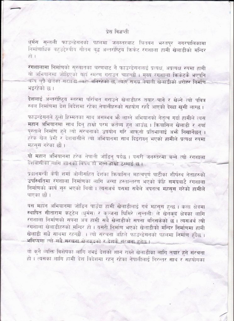 काठमाडौं (हाम्रो खेलकुद)– धुर्मस सुन्तली फाउन्डेसनको पहलमा जनस्तरबाट चितवन भरतपुर नगरपालिकामा निर्माणाधिन बहुउद्देश्यीय गौतम बुद्ध अन्तर्राष्ट्रिय क्रिकेट रंगशाला निर्माणमा देशका ख्याती प्राप्त खेलाडीहरुले ऐक्यबद्धता जनाएका छन् ।