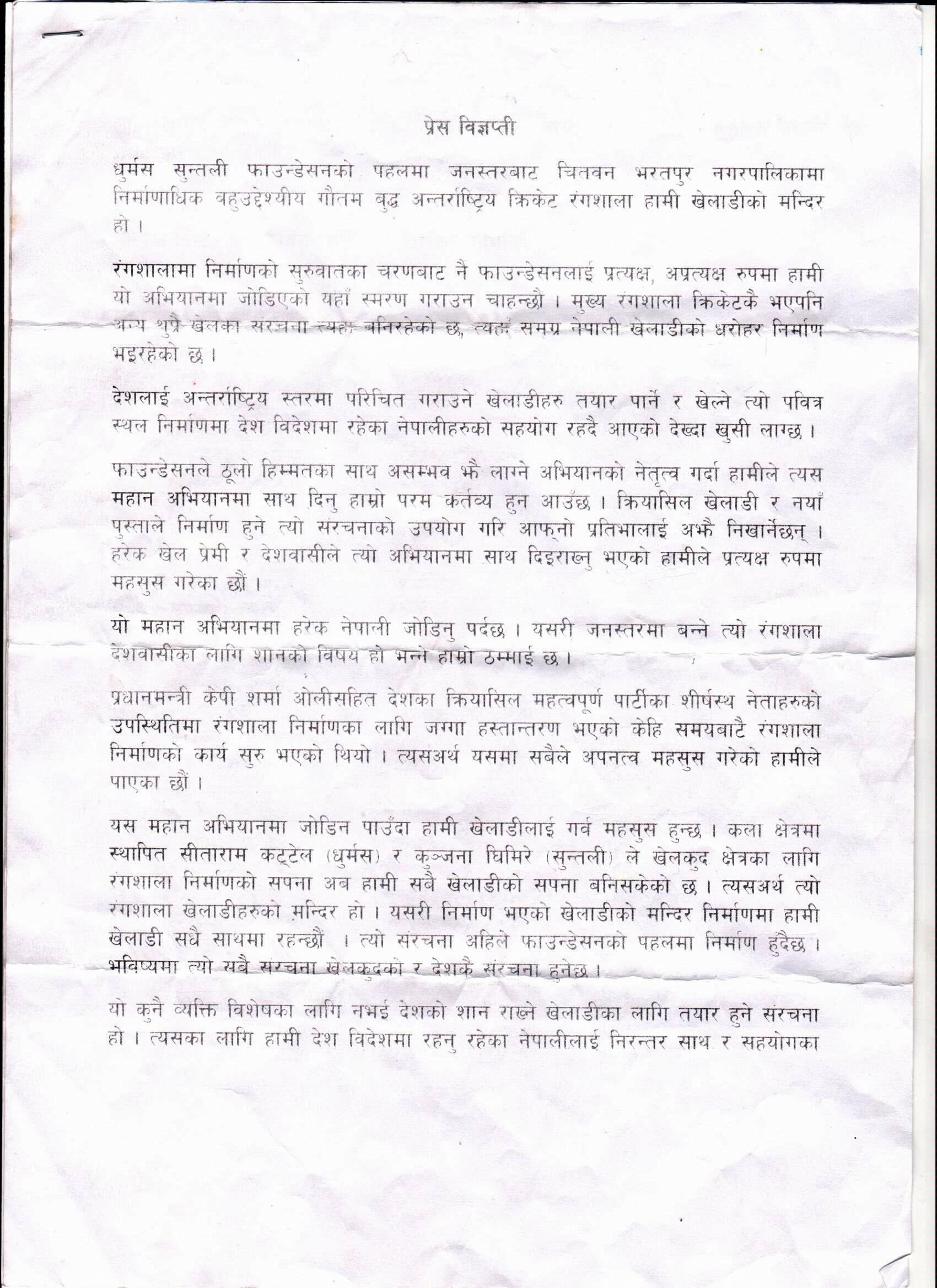 रंगशाला निर्माणको महान अभियानमा हरेक नेपालीलाई जोडिन आव्हान गर्दै खेलाडीहरुले जनस्तरमा बन्ने त्यो रंगशाला देशवासीका लागि शानको विषय हो आफूहरुकोे ठम्माई रहेको जनाएका छन् । प्रधानमन्त्री केपी शर्मा ओलीसहित देशका क्रियासिल महत्वपूर्ण पार्टीका शीर्षस्थ नेताहरुको उपस्थितिमा रंगशाला निर्माणका लागि जग्गा हस्तान्तरण भएको स्मरण गर्दै खेलाडीहरुले यस महान अभियानमा जोडिन पाउँदा गर्व महसुस भएको विज्ञप्तीमार्फत उल्लेख गरेका छन् ।