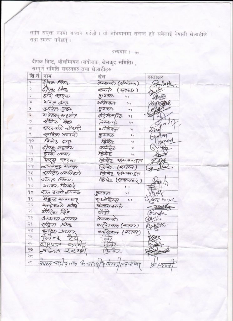 विज्ञप्तीमा विष्ट, श्रेष्ठसहित राष्ट्रिय क्रिकेट टोलीका कप्तान ज्ञानेन्द्र मल्ल, पूर्व कप्तान विनोद दास, पारस खड्का, राष्ट्रिय भलिबल टोलीका पूर्व कप्तान भरत शाह, राष्ट्रिय फुटबल टोलीका पूर्व कप्तान हरि खड्का, अनिल गुरुङ, राष्ट्रिय बास्केटबल टोलकिा कप्तान सधिशप्रदान को हस्ताक्षर रहेको छ ।