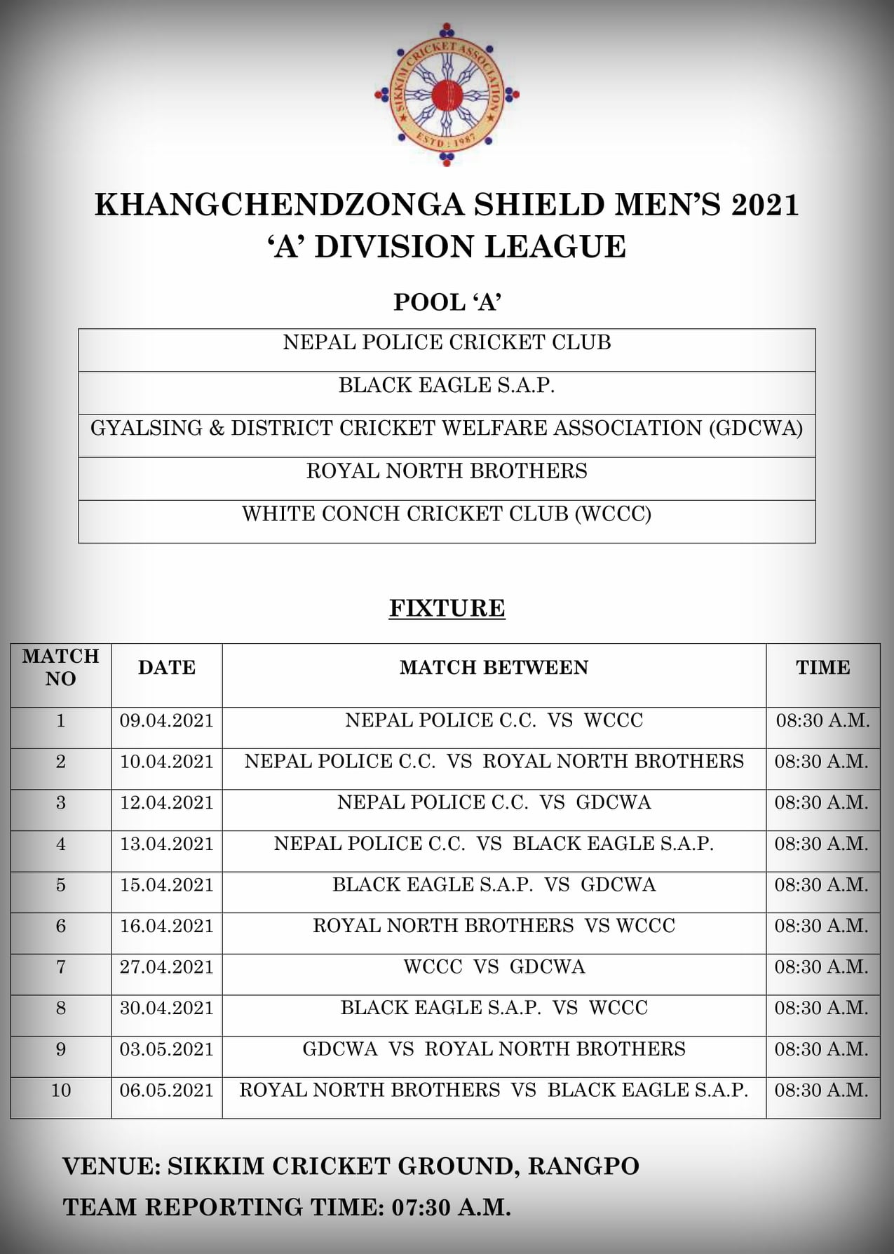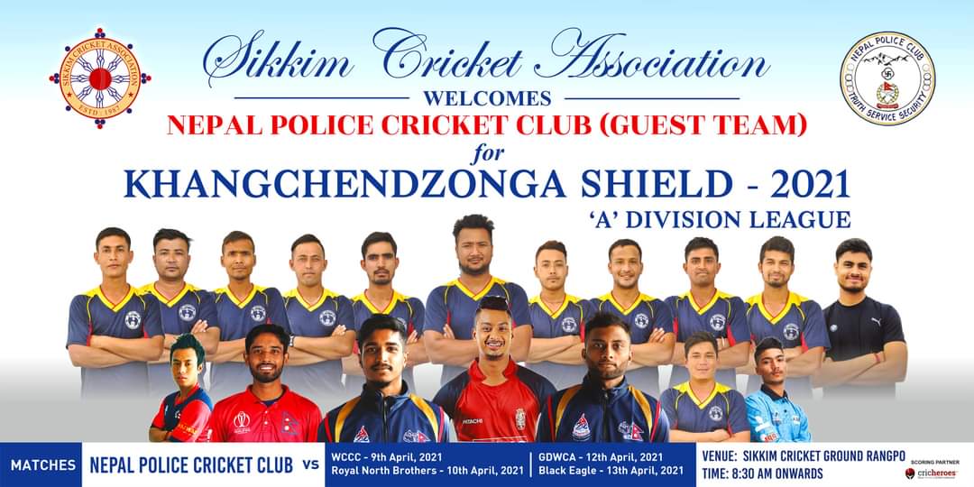 सिक्किम क्रिकेट एसोसियसनले आयोजना गर्न लागेको ए डिभिजन लिग क्रिकेट खेल्न पुलिस बुधबार त्यसतर्फ प्रस्थान गरेको थियो । प्रतियोगितामा नेपाल आमन्त्रिण टोलीको रुपमा खेल्ने सिक्किमले जनाएको छ । पुलिस समूह ए मा छ । समूह ए मा पुलिससँगै ब्लाक एंगल एसएपि, रोयल नथर्न ब्रोर्दश, ह्वाइट कन्च र ज्ञालसिंह एण्ड डिस्टिक वेलफेयर क्रिकेट एसोसियसन छन् । पुलिसले पहिलो खेल शुक्रबार ह्वाइट कन्चसँग खेल्ने छ । खेल सिक्किम क्रिकेट ग्राउन्ड राङ्पोमा हुने छ । खेल विहान ८ : ४५ मा सुरु हुने छ ।