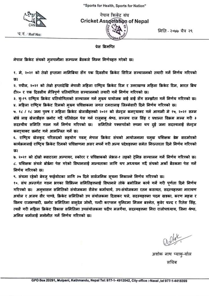 क्यानको बोर्ड बैठकले १८–१८ पुरुष महिला खेलाडीलाई २०२१ को केन्द्रिय सम्झौता गर्न आगमी मे १५ मा बोर्डलाई खेलाडी छनोट गर्दै प्रतिवेदन पेस गर्न राजबाबु श्रेष्ठ, सञ्जय राज सिंह र प्रशान्त विक्रम मल्ल गरि तीन सदस्य समिति गठन गर्ने निर्णय गरेको छ ।