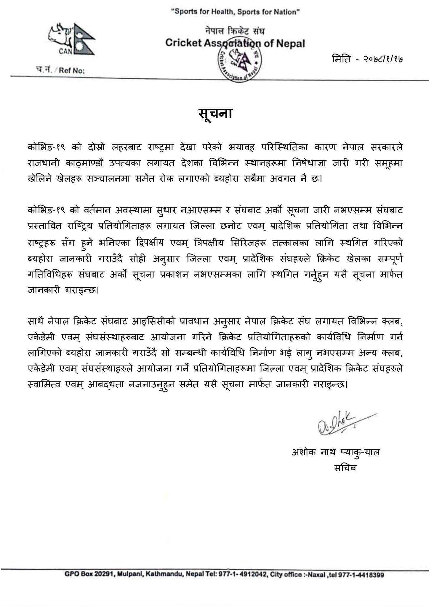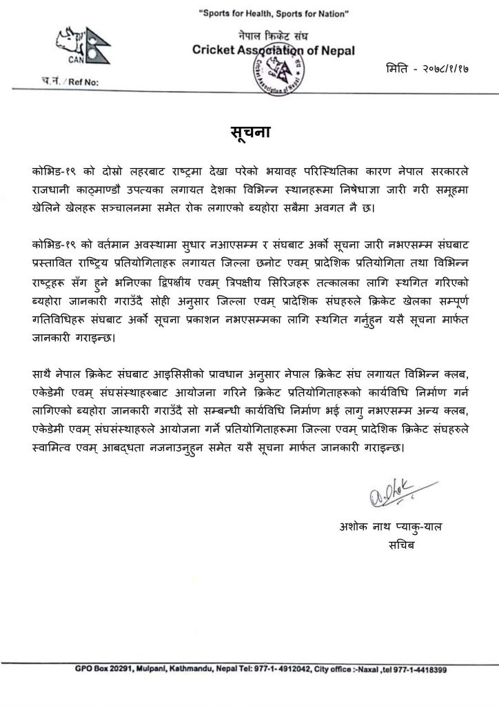 नेपाल क्रिकेट संघ (क्यान) ले कोरोना माहामारीको कारण एक प्रेस विज्ञप्ति जारी गर्दै प्रस्तावित राष्ट्रिय प्रतियोगिता, जिल्ला तथा प्रदेश छनोट तथा द्धिपक्ष्य तथा त्रिकोणात्मक अन्तर्राष्ट्रिय सिरिज स्थगित भएको जनाएको छ । सम्पूर्ण जिल्ला तथा प्रदेशसंघलाई खेलका सम्पूर्ण गतिविधि अर्को सूचना जारी नगर्न सम्म स्थगित गर्न प्रेस विज्ञप्ति मार्फत जानकारी गराएको छ । क्यानको कार्यतालिका अनुसार नेपालले आगमी मे मा नामिबियासँग एकदिवसिय सिरिज खेल्ने तयारी थियो ।