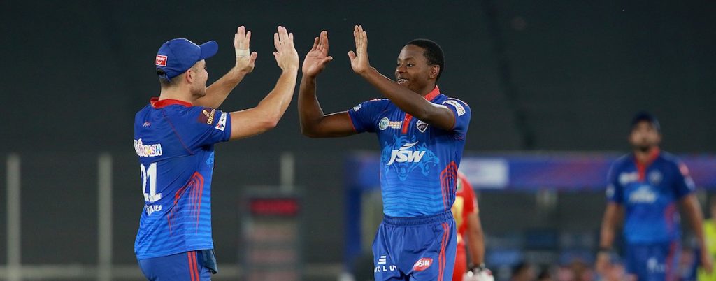 रबाडालेनै छैटौं ओभरको दोस्रो बलमा क्रिस गेललाई १३ रनमा बोल्ड आउट गरेका थिए । गेलले ९ बलमा १ चौका र १ छक्का प्रहार गरे ।तेस्रो विकेटका लागि डेब्यू गरेका डेविड मलान र अग्रवालले ४७ बलमा ५२ रनको साझेदारी गरेका थिए । १४ औं ओभरको पहिलो बलमा अक्षर पटेलले मलानलाई २६ रनमा बोल्ड आउट गर्दै साझेदारी तोडेका थिए ।