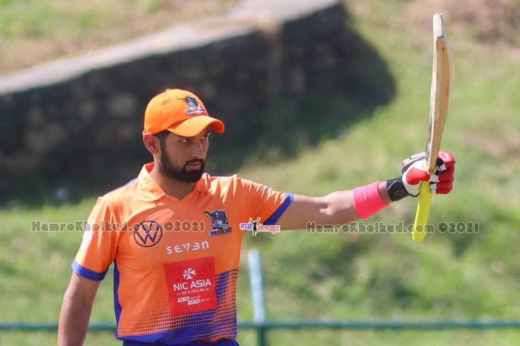 युवा ब्याटर भीम सार्की ११ बलमा ५ चौका र १ छक्का सहित ३० रन जोड्दै क्याच आउट भए । भीम करण केसीको छैटौं ओभरको तेस्रो बलमा आसिफबाट क्याच हुन पुगेका थिए । त्यसअघि भीमले राजालाई पाँचौ ओभरको अन्तिम चार बलमा लगातार चार चौका प्रहार गरेका थिए ।