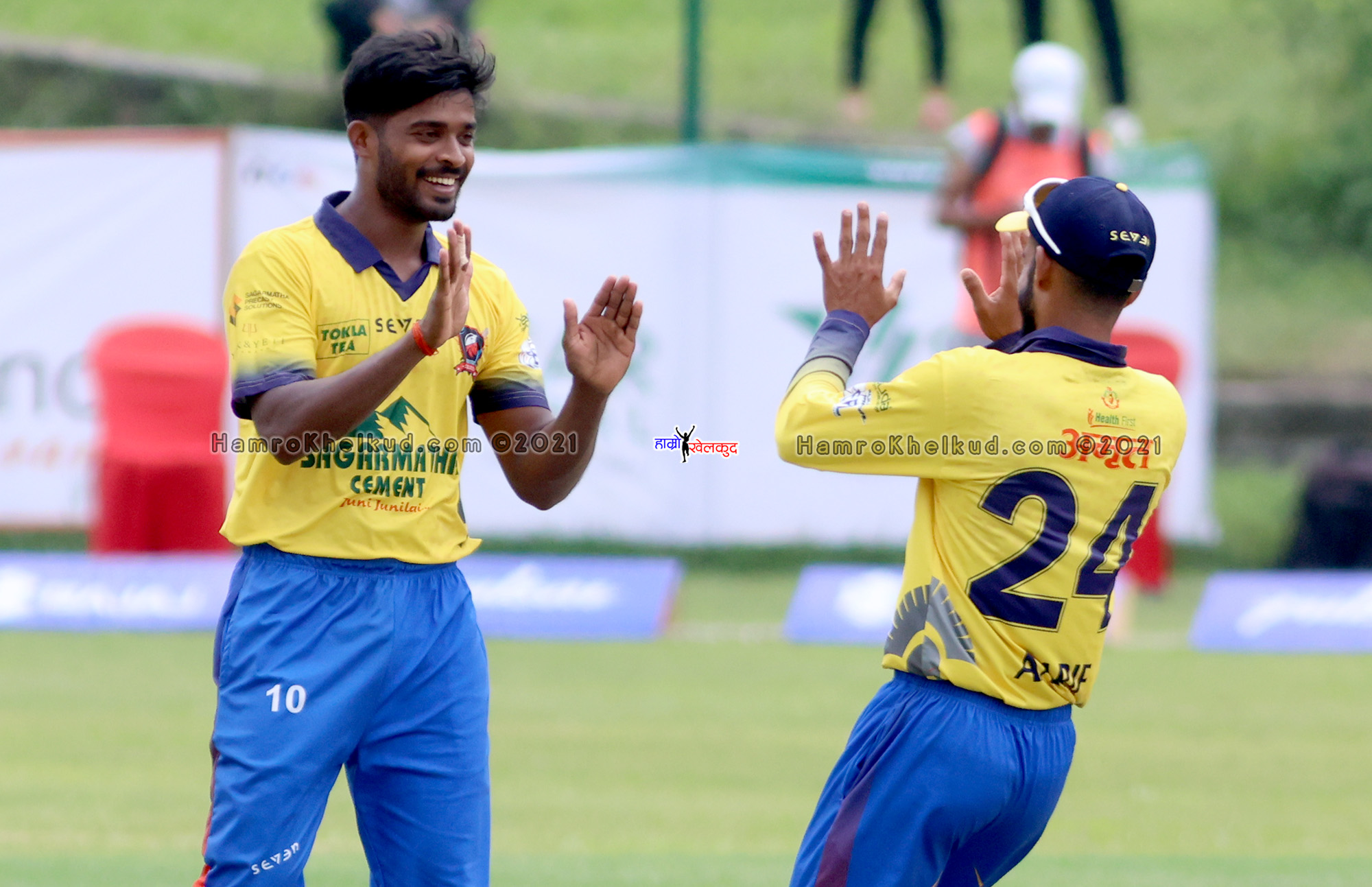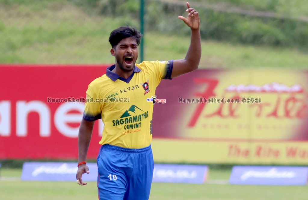 दुर्गेशले दोस्रो ओभरको अन्तिम दुई बलमा दुई विकेट लिएका थिए । इपिएलमा पाहिलो खेल खेलि रहेका दुर्गेशले दोस्रो ओभरको पाँचौ बलमा विपिन रावललाई ६ रनमा प्रदीप ऐरीबाट क्याच आउट गराए । अर्को बलमा कप्तान विनोद भण्डारीलाई शून्यमा बोल्ड आउट गरे । विनोद गोल्डेन डक आउट भए ।