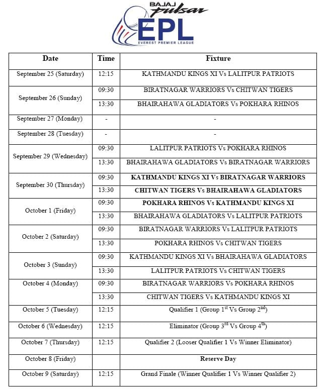 इपिएलले सोमबार राती नयाँ तालिका सार्वजनिक गरेको थियो । तर मंगलबारको पनि खेल हुन नसकेपछि पुन नयाँ तालिका सार्वजनिक गरेको छ । सोमबार तालिका अनुसार चितवन टाइगर्सले लगातार चार खेल खेल्नुपर्ने थियो । इपिएलले एक पटक स्थगित भएका खेलहरु अब वर्षाको कारण पुन: स्थगित भएमा अंक बाँडिने जनाएको छ ।