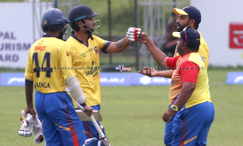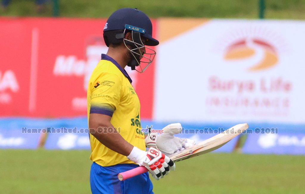 १७ औं ओभरको अन्तिम बलमा थर्डबाट रोहितले डाइरेक्ट थ्रोमा सन्दीपलाई रन आउट गराएका थिए । पवन सरार्फ १ रनमा बोल्ड आउट भए । योगेन्द्रसिंह कार्की ७ रनमा आउट भए । भैरहवाका अभिनाष बोहराले ४ ओभरमा ४७ रन खर्चेर २ विकेट लिए । कृष्ण कार्की, धाम्मिका प्रसाद, अभिनाष बोहरा र आरिफ शेखले १–१ विकेट लिए ।