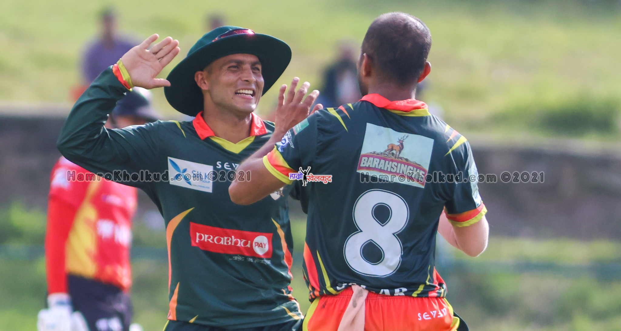 राशिद खान ५ र रिजन ढकाल २ रनमा आउट भए । ललितनारायण राजवंशी ९ र सूर्य तामाङ ११ रनमा अविजित रहे । सूर्यले १८ बलमा १ छक्का प्रहार गरे । ललितले १५ बलमा १ चौका प्रहार गरे । अन्तिम विकेटका लागि ललित र सूर्यले अविजित २४ रनको साझेदारी गरेका थिए । ललितपुरका सागर ढकालले ४ ओभरमा १४ रन खर्चेर २ विकेट लिए । करिम जन्नतले ४ ओभरमा २४ रन खर्चेर २ विकेट लिए । कमलसिंह ऐरीले ४ ओभरमा १ मेडन सहित ११ रन खर्चेर ३ विकेट लिए । साहब आलमको नाममा १ विकेट रह्यो ।