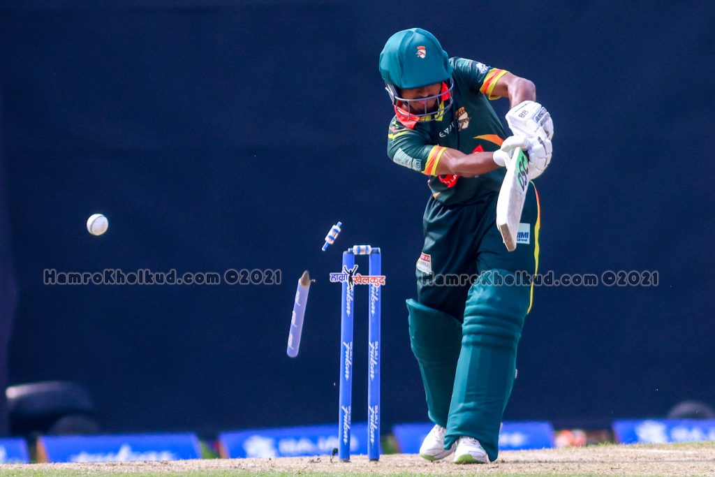 तीव्र गतिका बलर धाम्मिका प्रसादले तेस्रो ओभरको दोस्रो बलमा ओपनर खडक बहादुर बोहरालाई शून्यमा बोल्ड आउट गरे । स्पिनर कुशल मल्लको नवौं ओभरको तेस्रो बलमा ठूलो सट खेलेका शाहजाद लङअफमा दुर्गेश गुप्ताबाट क्याच आउट भएका थिए । करिम जन्नतले ब्यक्तिगत २० रनमा जीवनदान पाएका थिए ।