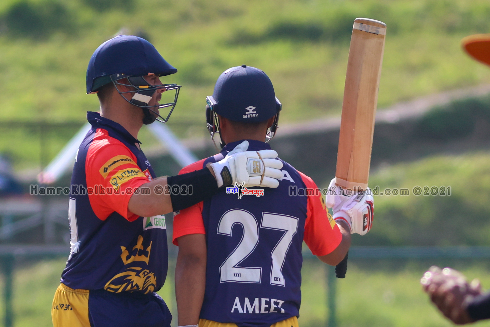 कमजोर सुरुवात गरेको काठमाडौंलाई तेस्रो विकेटका लागि रायन र अमितले १ सय ६ रनको उत्कृष्ट शतकीय साझेदारी गर्दै पूनरागमन गरेका थिए । दोस्रो ओभरको दोस्रो बलमा ओपनर रहमानउल्लाह गुरबाजलाई रित गौतमले १२ रनमा रन आउट गर्दै पोखरालाई महत्वपूर्ण सफलता दिलाएका थिए । रितले ननस्ट्राइकमा सिधैं स्टम्प ताक्दै गुरबाजलाई पेभिलिएनको बाटो देखाए ।