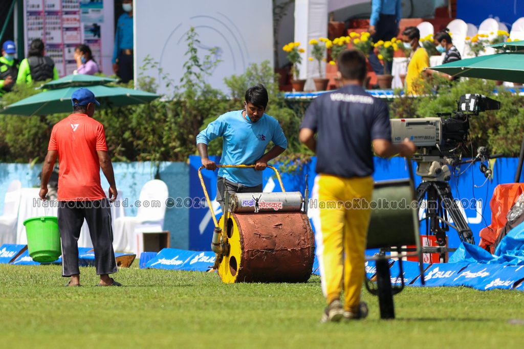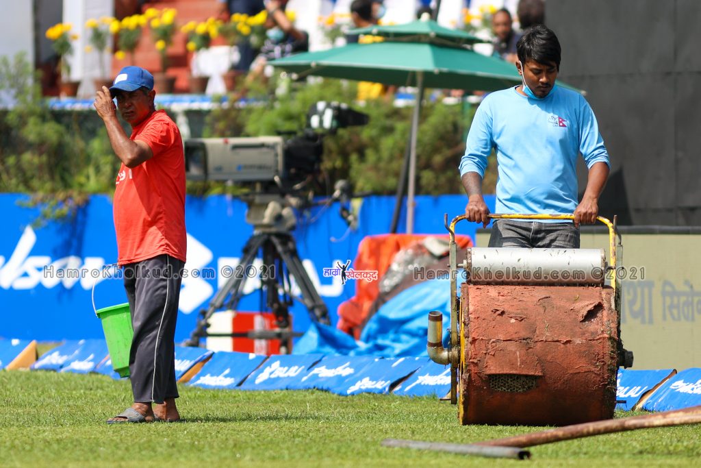 खेल निर्धारित समय अनुसार ९ : ३० मा सुरु हुनेपर्ने थियो । तर सोमबार भारी वर्षाको कारण भिजेको आउटफिल्ड खेल हुने सम्भावना निकै कम छ । मैदानका कर्माचारी पानी सुकाउन निरन्तर खटि रहेका छन् । तर मैदानको अवस्था हेर्दा खेल हुने सम्भावना निकै कम देखिन्छ ।