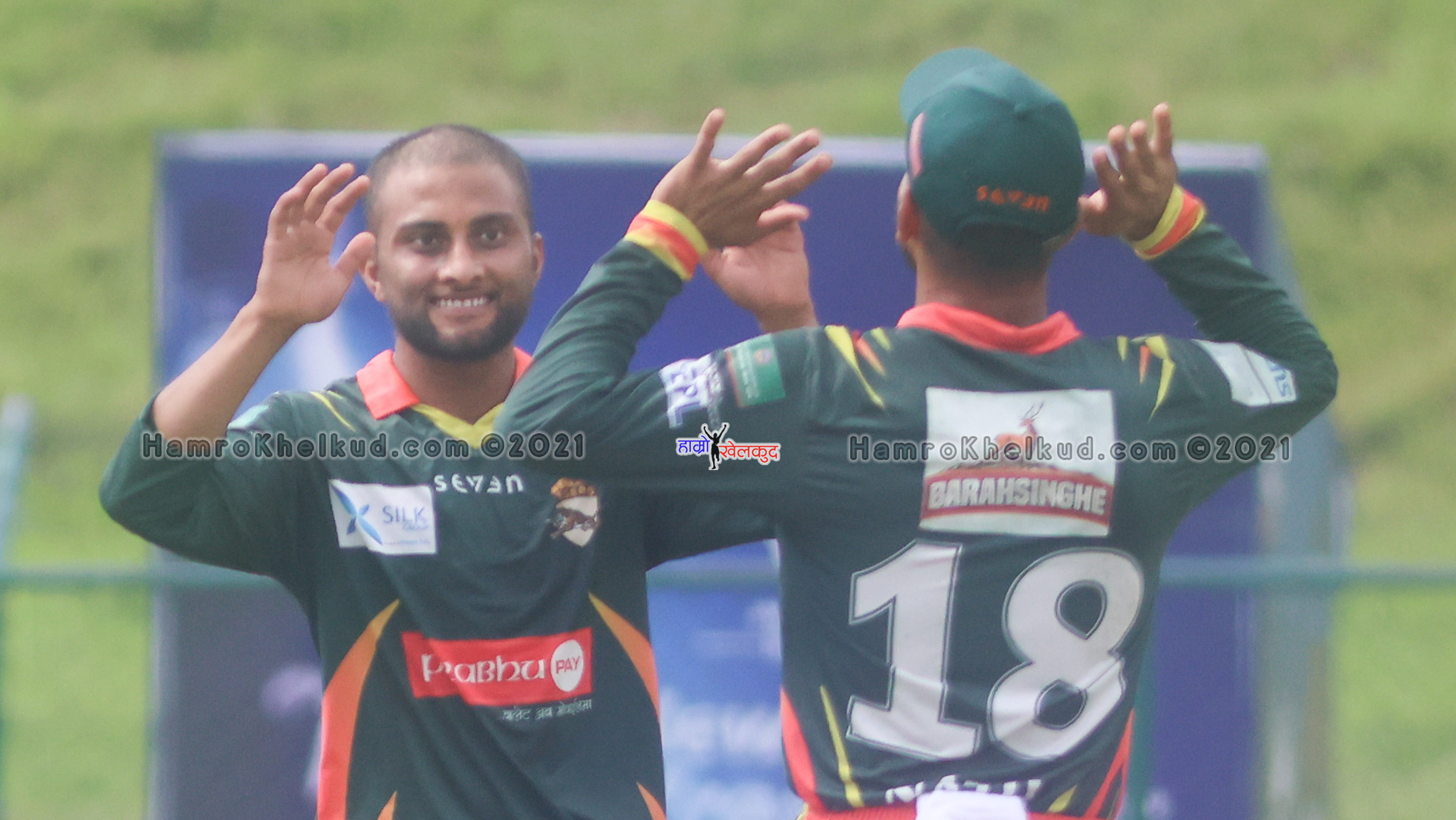 दशौं ओभरको पहिलो बलमा सागरले असेला गुणरत्नेलाई १ रनमा बोल्ड आउट गर्दै पोखरालाई ४३-५ को अवस्थामा पुगेको थियो । सागरले विवेक यादवलाई २ रनमा एलबीडब्लू आउट गरेपछि पोखरा संकटमा पुगेको छ । पोखराले अन्तिम पाँच रन जोड्न ५ प्रमुख ब्याटरलाई गुमाएपछि ठूलो समस्यामा परेको थियो । लोकेश बम ५ र विक्रम सोब ३ रनमा आउट भए ।