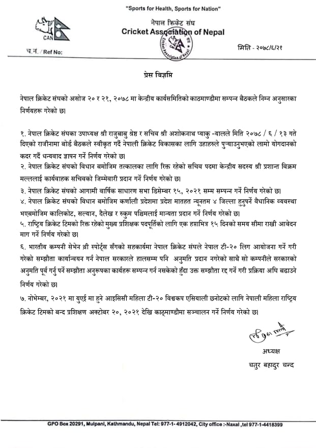 क्यान बोर्ड बैठकले कार्यवाहक सचिव, नेपाली टोलीको मुख्य प्रशिक्षकको लागि खुल्ला आवदेन देखि कर्णाली प्रदेशका चार जिल्लालाई सदस्यता प्रदान गर्ने सम्मका निर्णय गरेको छ । क्यानका सचिव अशोकनाथ प्याकुरेल र उपाध्यक्ष राजुबाबु श्रेष्ठले अघिल्लो हप्ता पदबाट राजीनामा दिएका थिए ।