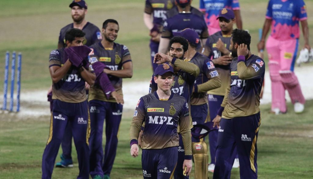 नितिश राणा १२, राहुल त्रिपाठी २१, दिनेश कार्तिक १४ र ओईन मोर्गन १३ रन बनाए । राजस्थानका क्रिस मोरिस, चेतन सकारिया, राहुल टेवटिया र ग्लेन फिलिप्सले १–१ विकेट लिए ।