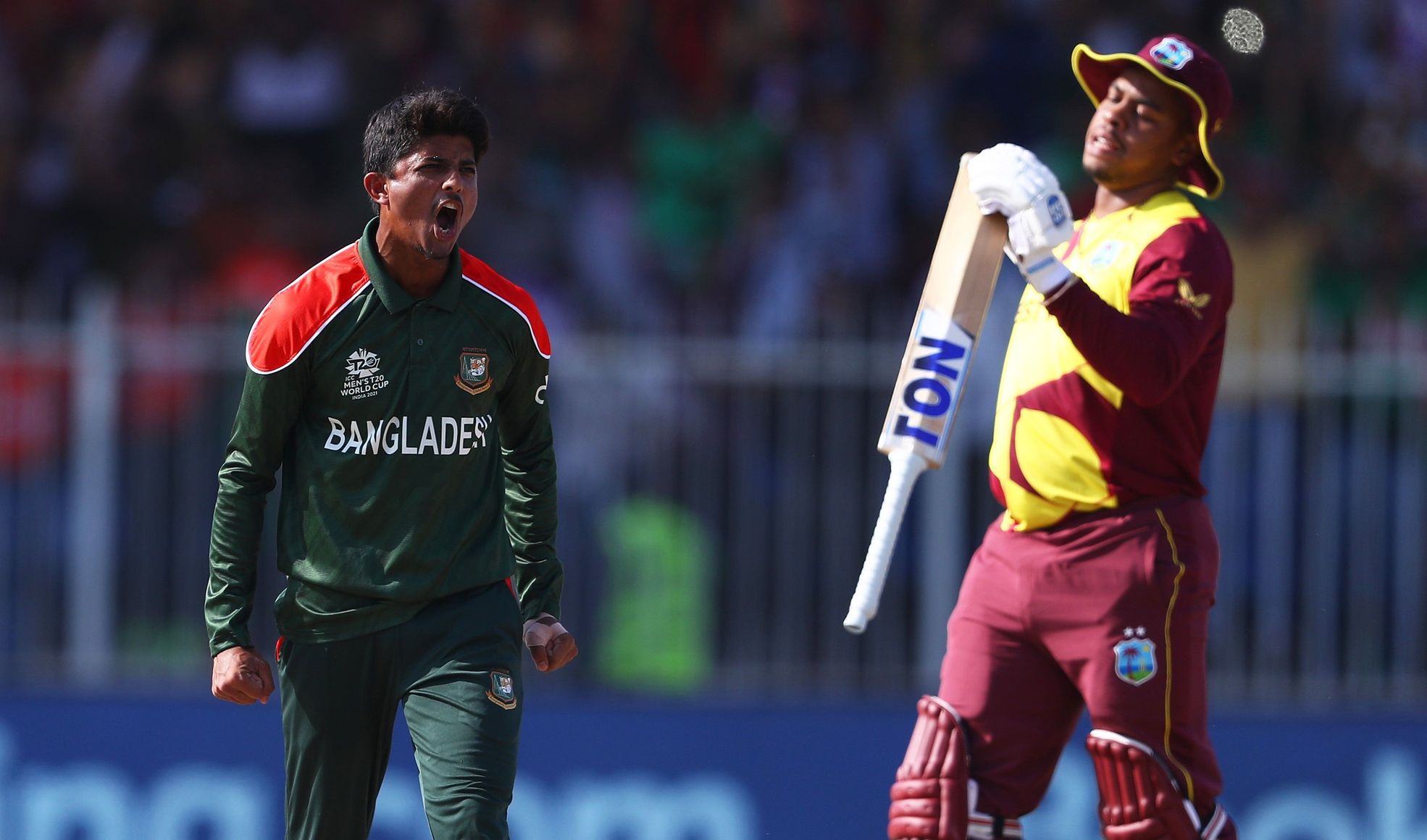 तीव्र गतिका बलर मुश्ताफिजुर रहमान इविन लेविसलाई ६ रनमा मुश्फिकुर रहिमबाट क्याच गराउँदै पहिलो सफलता दिलाएका थिए । माहेदी हसनले पाँचौं ओभरको दोस्रो बलमा अनुभवी ब्याटर क्रिस गेललाई ४ रनमा बोल्ड आउट गरे । माहेदी हसनलेनै सातौं ओभरको चौथो बलमा शिम्रन हेटमायरलाई ९ रनमा सौम्य सरकारबाट क्याच गराउँदै वेस्टइन्डिजलाई ३२–३ को कमजोर अवस्थामा पुर्याएका थिए । १३ औं ओभरमा तेस्रो बलमा आन्द्रे रसेल दुर्भाग्यपूर्ण कुनै बल नखेली रन आउट भए । तस्किन अहमदको बलमा रोश्टन चेशले प्रहार गरेको सट नन स्ट्राइकको स्टम्पमा लागेपछि रसेल रन आउट भएका थिए ।