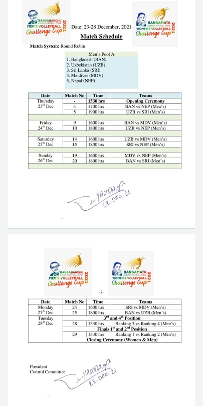 नेपालले दोस्रो खेलमा शुक्रबार उज्वेकिस्तान, तेस्रो खेलमा शनिबार श्रीलंका र चौथो तथा अन्तिम खेल आइतबार माल्दिभ्ससँग खेल्नेछ । राउन्ड रोविन लिगपछि शीर्ष २ टोलीले मंगलबार फाइनल खेल्नेछन् । त्यसअघि सोही दिन तेस्रो र चौथो स्थानका लागि पनि प्रतिस्पर्धा हुनेछ ।