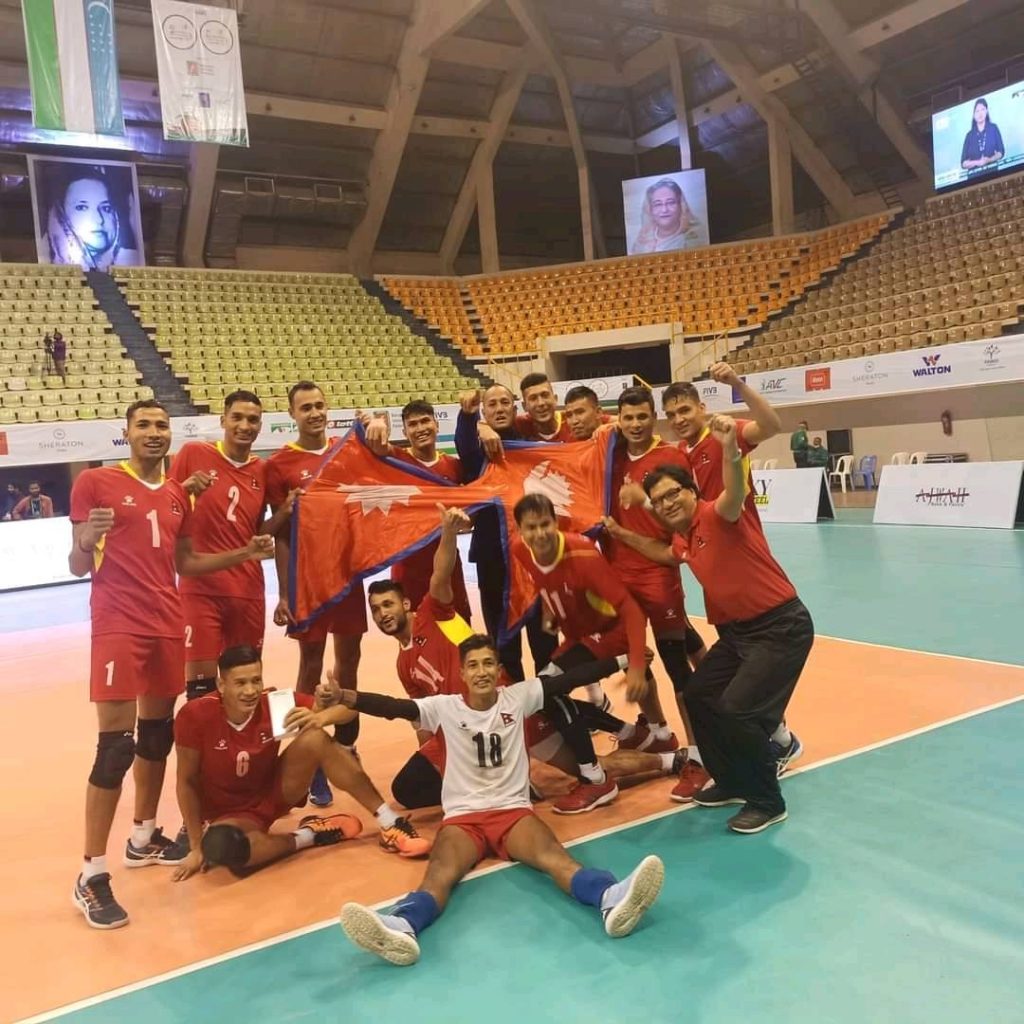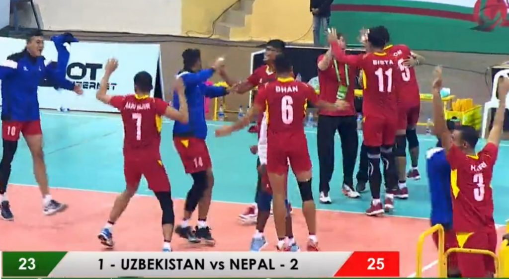 बंगलादेशको ढाका मिरपुरस्थित शाहिद शुरवार्दी इन्डोर स्टेडियममा शुक्रबार भएको खेलमा नेपालले पहिलो सेट १८–२५ ले गुमाएको थियो । दोस्रो सेटमा २५–२१ र तेस्रो सेट २५–१८ ले सहजै जितेको नेपालले प्रतिस्पर्धात्मक चौथो सेटमा २५–२३ को जित निकाल्न सफल भयो ।