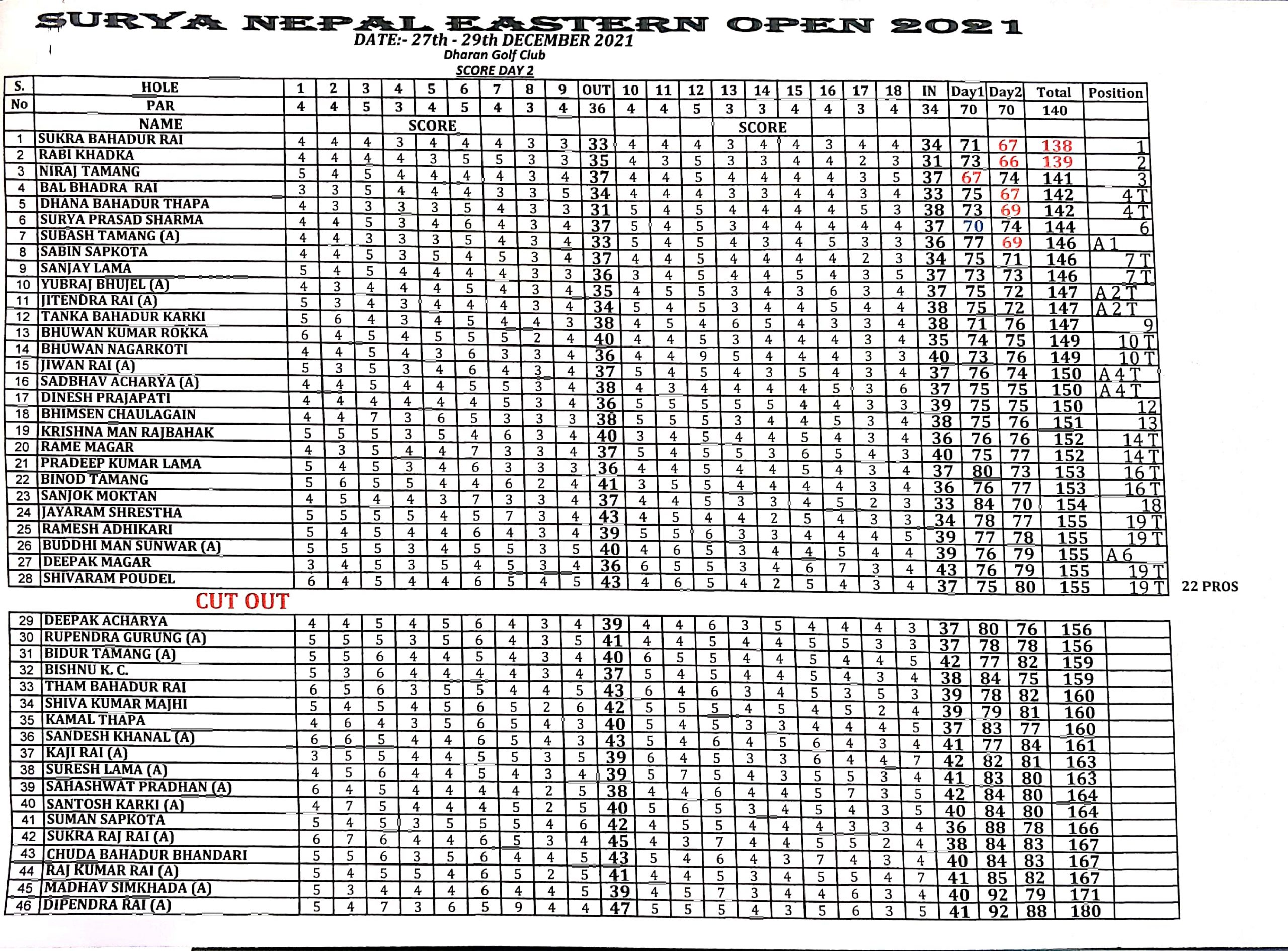 दोस्रो स्थानका रवी खड्काले १ अन्डर १ सय ३९ स्कोर बनाएका छन् । रवीले दोस्रो दिनकै उत्कृष्ट प्रदर्शन गर्ने क्रममा ४ अन्डर ६६ को स्कोर लेखाए । उनले पहिलो दिन ३ ओभर ७३ खेलेका थिए । पहिलो दिन अग्रतामा रहेका निरज तामाङले दोस्रो दिन ४ अन्डर ७४ को स्कोर जोड्दै समग्रमा तेस्रो भए । उनले समग्रमा १ ओभर १ सय १४१ स्कोर जोडेका छन् ।