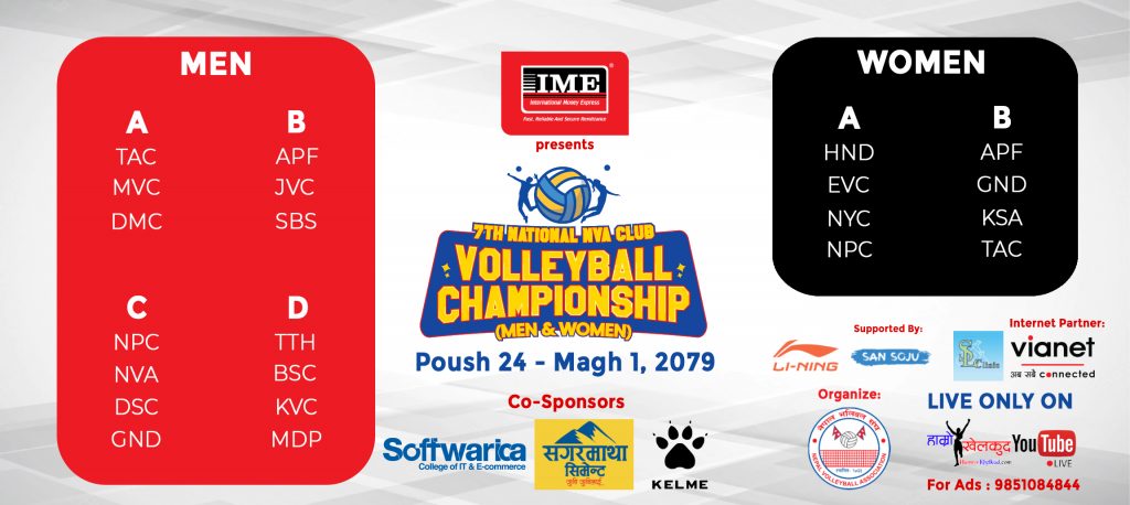काठमाडौं (हाम्रो खेलकुद) – सातौं राष्ट्रिय एनभिए क्लब भलिबल च्याम्पियनसिप २०७९ का लागि शुक्रबार समूह विभाजन भएको छ । आइतबारदेखि सुरु हुने प्रतियोगितामा पुरुषतर्फ १५ र महिलातर्फ ८ टोलीले प्रतिस्पर्धा गर्दैछन् ।