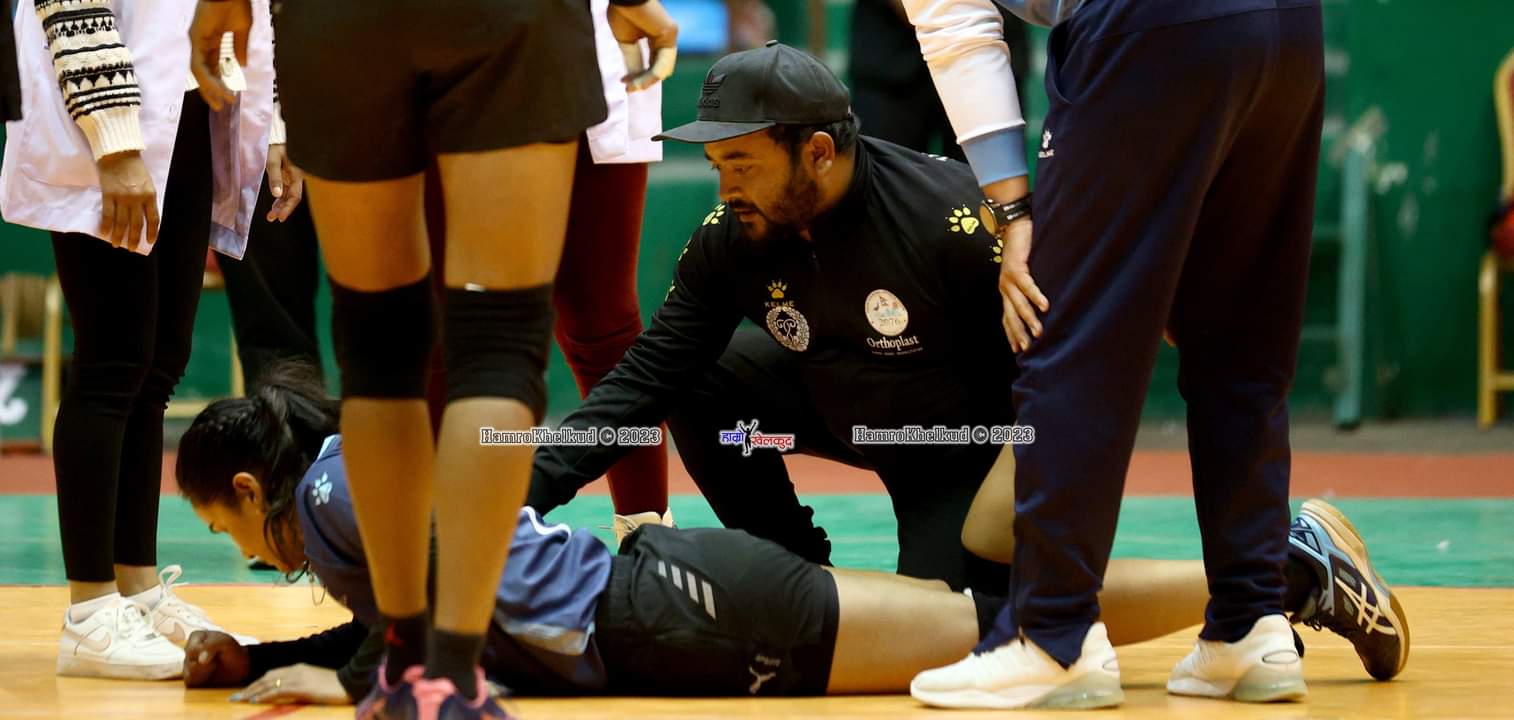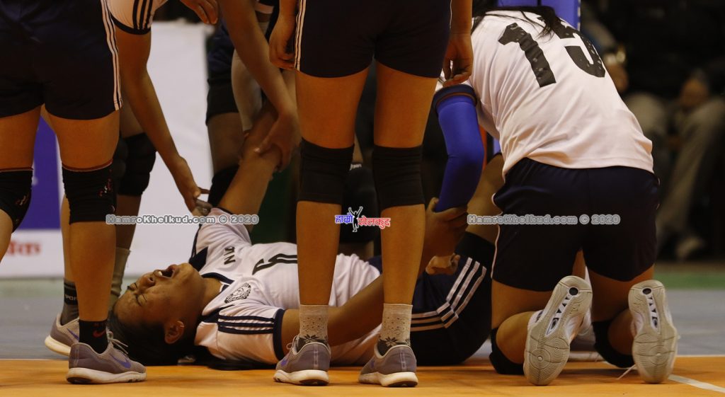 एपिएफकी स्पाइकर निरुता ठगुन्ना चौथो सेटमा घाइते हुन पुगिन् । खेलमा एपिएफ २१–२० ले अघि थियो । प्रतिभाले प्रहार गरेका स्पाइक एपिएफकी मनिषा तामाङले राम्रो बचाउ गर्दै उठाएपछि सरस्वती चौधरीले निरुतालाई स्पाकइको लागि बल दिएकी थिइन् । निरुताले स्पाइक प्रहार गर्दा न्यू डायमण्डकी युवा खेलाडी सुमित्रा रेग्मीले राम्रो ब्लक गरिन् । ब्लक बल उठाउन खोज्दा निरुता दायाँ खुट्टाको तिघ्रामा समस्या आयो । निरुता कोर्टमा थचक्क बसिन् ।
