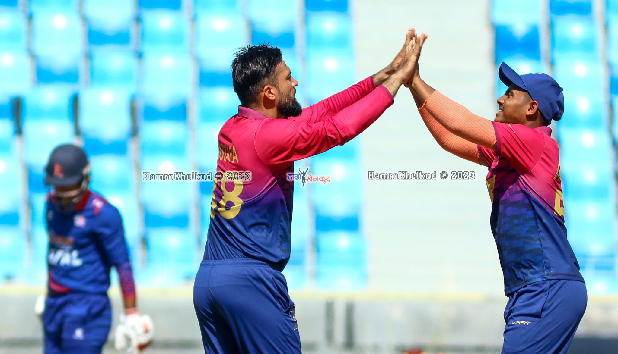 ज्ञानेन्द्र मल्ल, आसिफ शेख, भीम सार्की, रोहित पौडेल (कप्तान), कुशल मल्ल, आरिफ शेख, दीपेन्द्रसिंह ऐरी, प्रतिश जि।सी, सोमपाल कामी, करण केसी र सन्दीप लामिछाने ।