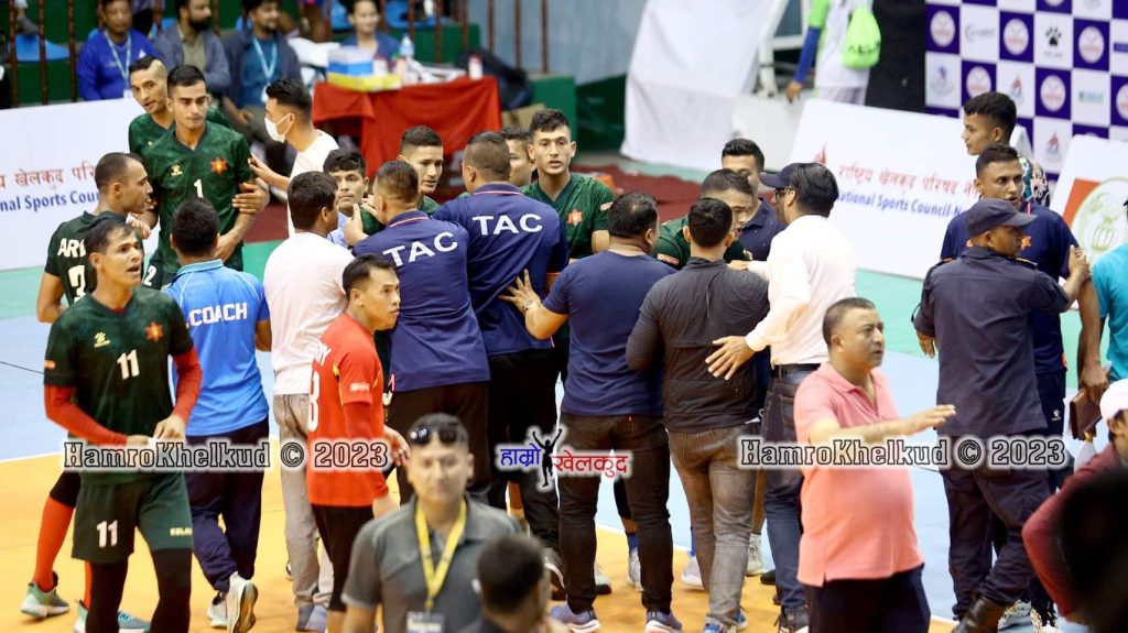 गण्डकीका खेलाडी र अफिसियल रेफ्रीसँग उक्त निर्णय बारे असन्तुष्टी जनाइरहँदा आर्मीका खेलाडीलाई बाहिरबाट समर्थकले बोतलले हाने । बेन्चकै पछि बसेका केहीले अपशब्द प्रयोग गरे । यसमा आर्मीका खेलाडी संयमित हुन सकेनन् । नेपाली राष्ट्रिय टिमका कप्तान हरिहजुर थापा नै आक्रोशित बन्दै समर्थकतर्फ फर्केर कराउन थाले । उनले हातमा रहेको खेलाडी परिवर्तन कार्ड समर्थकतर्फ तेर्स्याए पनि ।