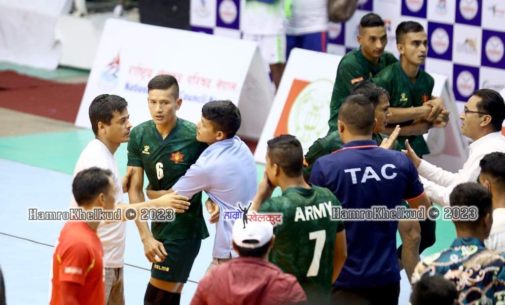 विभागमध्य खेलकुदमा सबैभन्दा प्रतिष्ठितको रुपमा चिनिने आर्मीले खेलमा तनावपूर्ण अवस्था सिर्जना गर्यो । नेपाल प्रहरीलाई सुरक्षा दिनै गाह्रो भएको थियो । अध्यक्ष जितेन्द्र चन्द र प्रशिक्षक जगत सिंहले सम्झाउँदै खेलाडीलाई बस्न आग्रह गरेका थिए ।