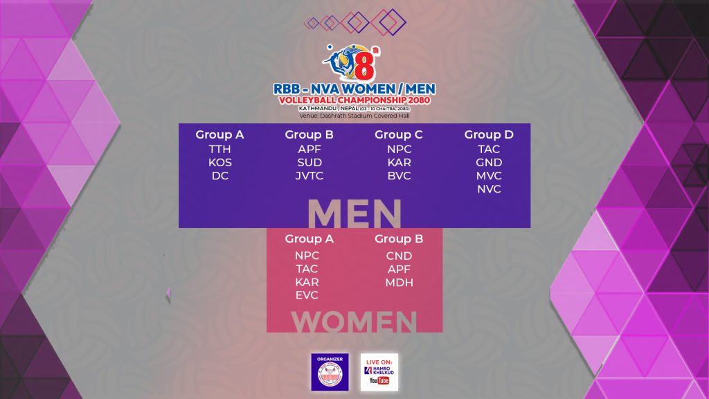 विहीबार काठमाडौंस्थित क्राउन प्लाजा होटेलमा भएको मुख्य प्राविधिक बैठकमा समूह विभाजन गरिएको हो । महिलातर्फ गत वर्षको शीर्ष २ टोलीलाई फरक समूहमा राखिएको थियो । त्यस्तै पुरुष तर्फ गत संस्करणको शीर्ष ४ स्थानमा आएका टोलीलाई ४ फरक समूहमा राखिएको थियो ।