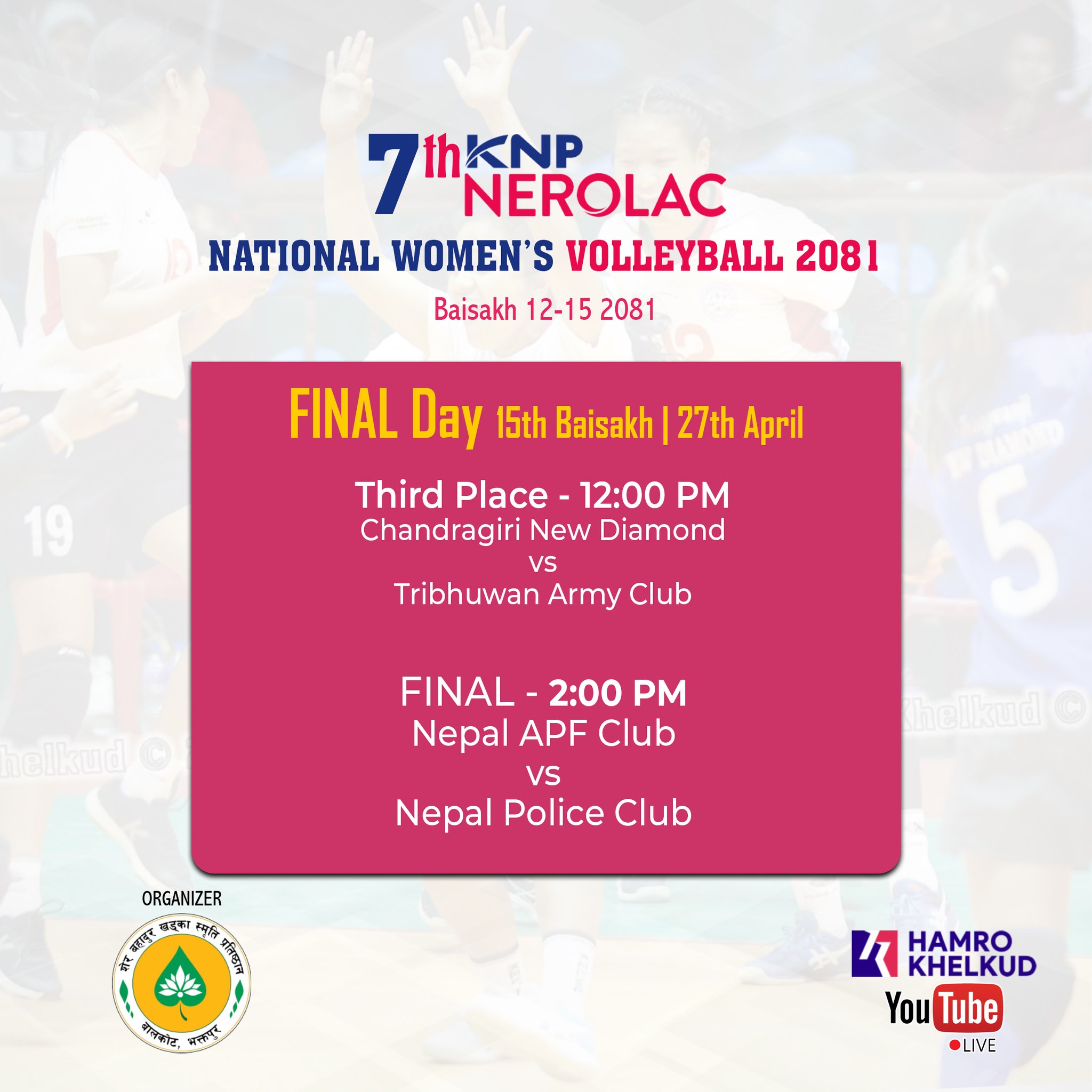 त्रिपुरेश्वरस्थित राष्ट्रिय खेलकुद कभर्डहलमा जारी प्रतियोगितामा शनिबार दिउँसो २ः०० बजे एपिएफले पुलिसको सामना गर्नेछ । साविक विजेता चन्द्रागिरी नगरपालिका न्यु डायमण्ड महिला टोली भने यसपटक फाइनल पुग्नबाट असफल रह्यो ।