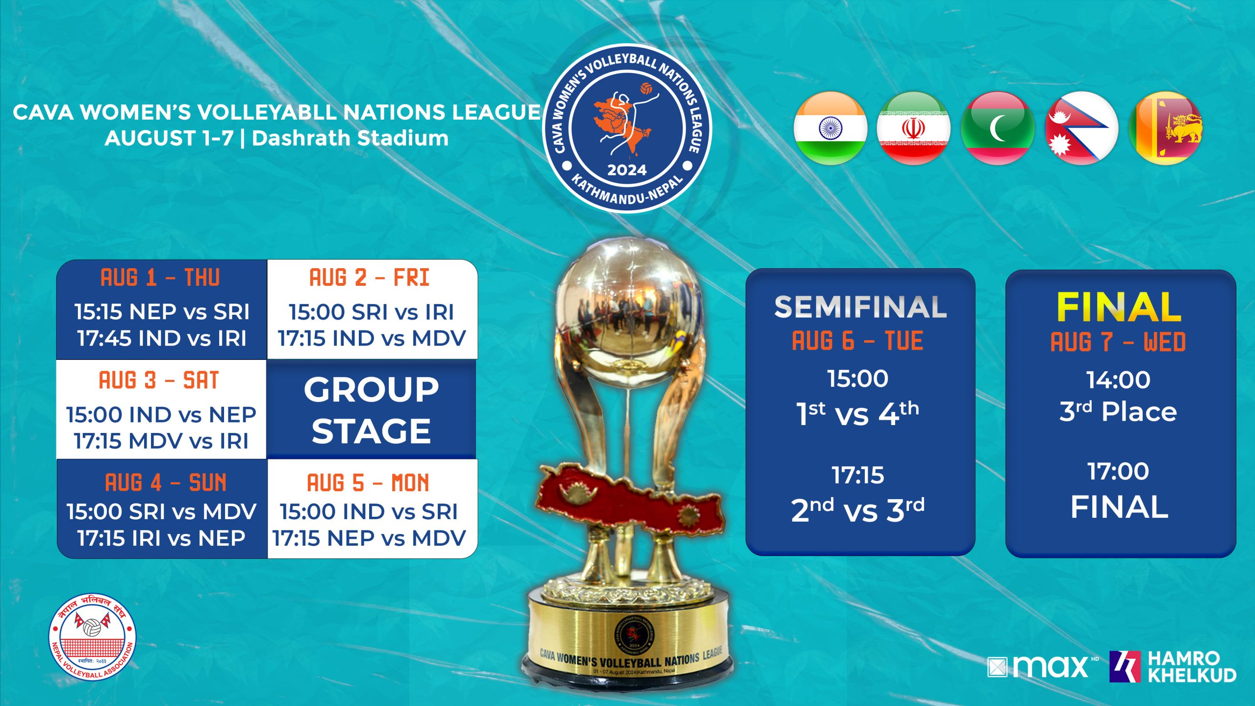 ७ दिन सम्म चल्ने प्रतियोगिताको पहिलो दिन नेपाल र श्रीलंका तथा इरान र भारतबीच खेल हुनेछ । नेपालले साउन १९ गते भारतसँग, साउन २० गते इरान र साउन २१ गते माल्दिभ्सको सामना गर्नेछ ।