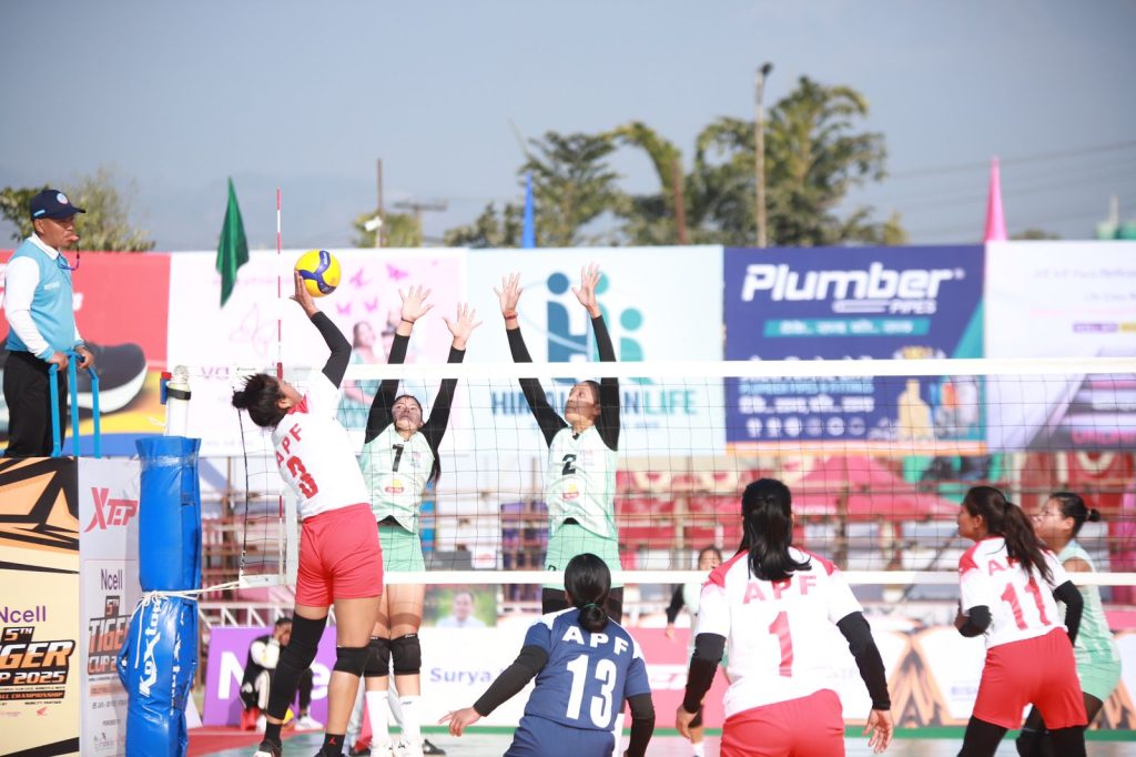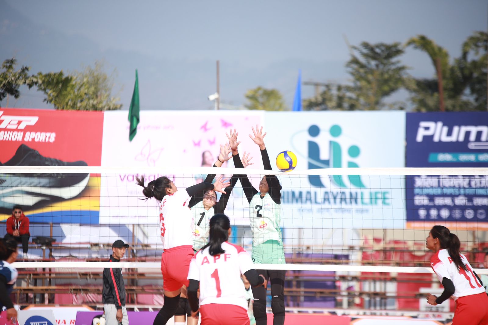 पोखरा रंगशालास्थित भलिबल कोर्टमा आइतवारको पहिलो खेलमा एपिएफले टिप टप न्यु डायमण्ड स्पोर्टस क्लबलाई सोझो सेटमा पराजित गरेको छ ।