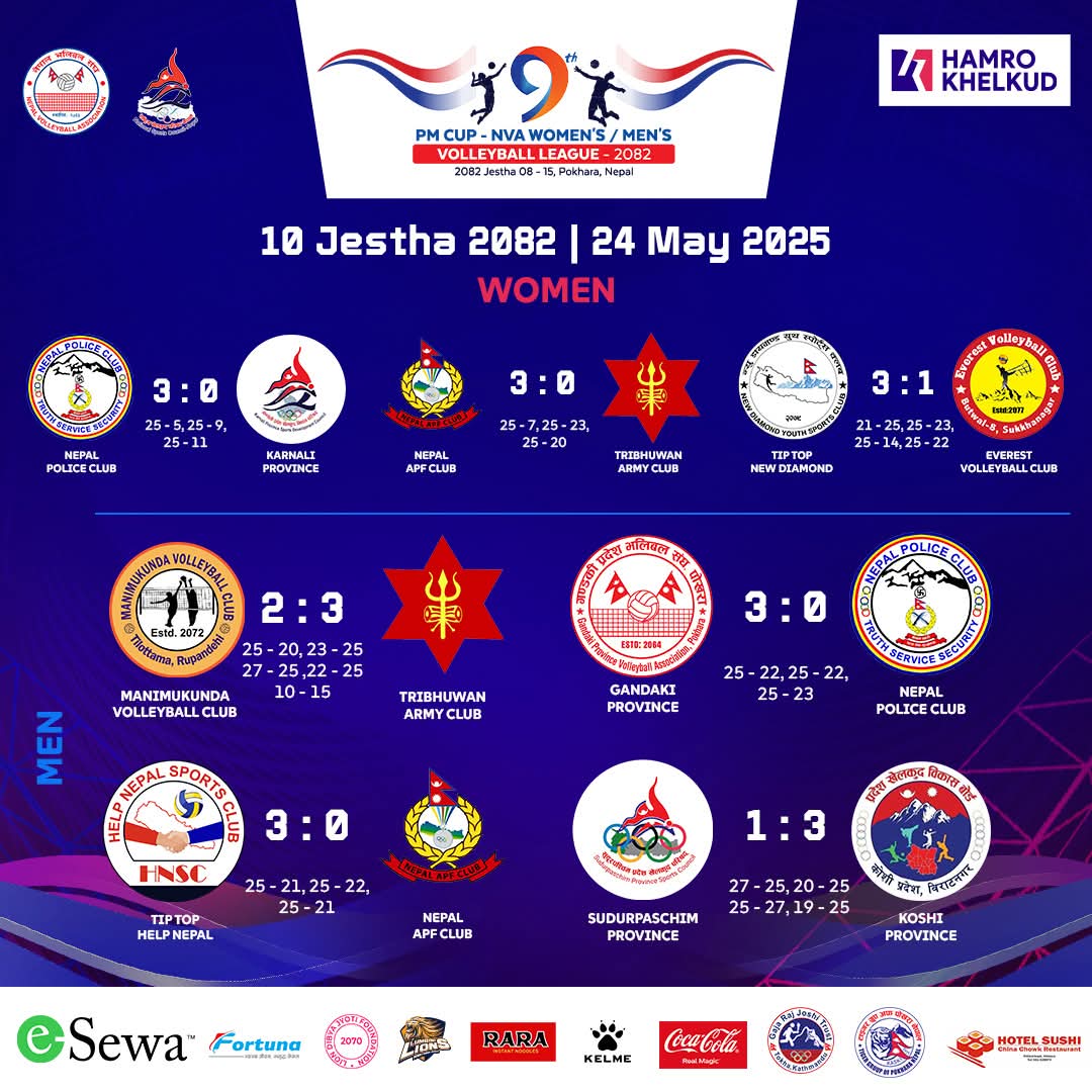 त्यसअघि आजै भएको महिलातर्फको खेलमा टिप टप न्यु डायमण्ड, नेपाल एपिएफ क्लब र पुलिसले जित हात पारेका थिए । तीनै टोलीले लगातार दोस्रो सफलता प्राप्त गरेका हुन्।