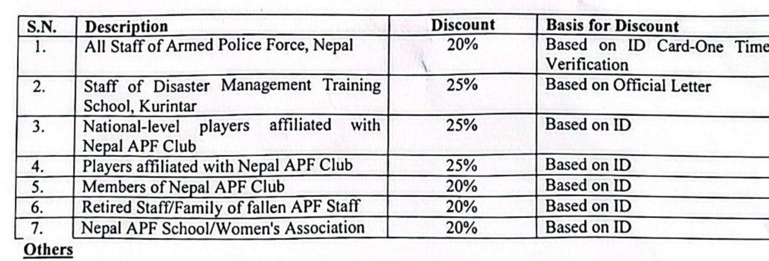 सशस्त्र प्रहरी बल, नेपालका बहालवाला, भु.पु. सशस्त्र प्रहरी कर्मचारीहरु तथा आश्रित परिवार, सहादत प्राप्त अमर सशस्त्र प्रहरी कर्मचारीका परिवारहरु, नेपाल एपीएफ स्कुल, सशस्त्र प्रहरी परिवार महिला संघ, नेपाल एपीएफ क्लबमा आवद्ध सदस्यज्यूहरु, खेलाडी, प्रशिक्षकहरुलाई देशभरका केल्मी नेपालका विक्री केन्द्रहरुबाट निश्चित प्रतिशत छुट दिने सम्झौता उल्लेख रहेको छ ।